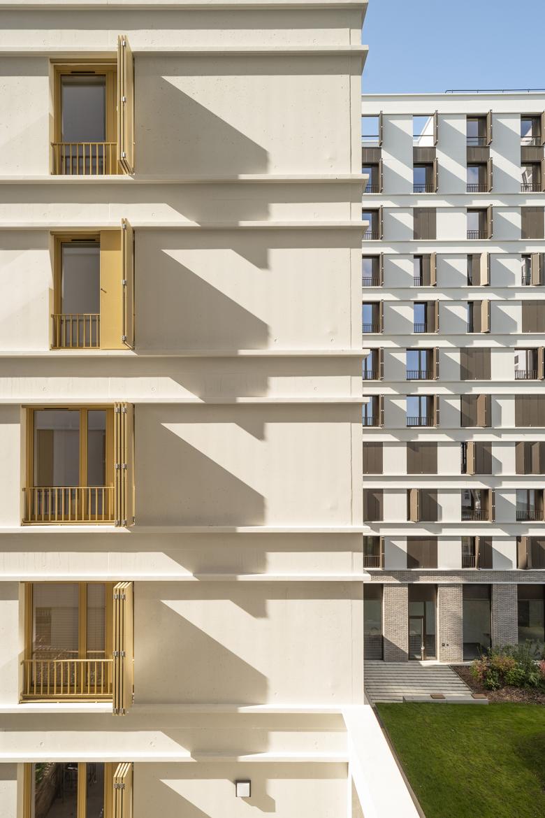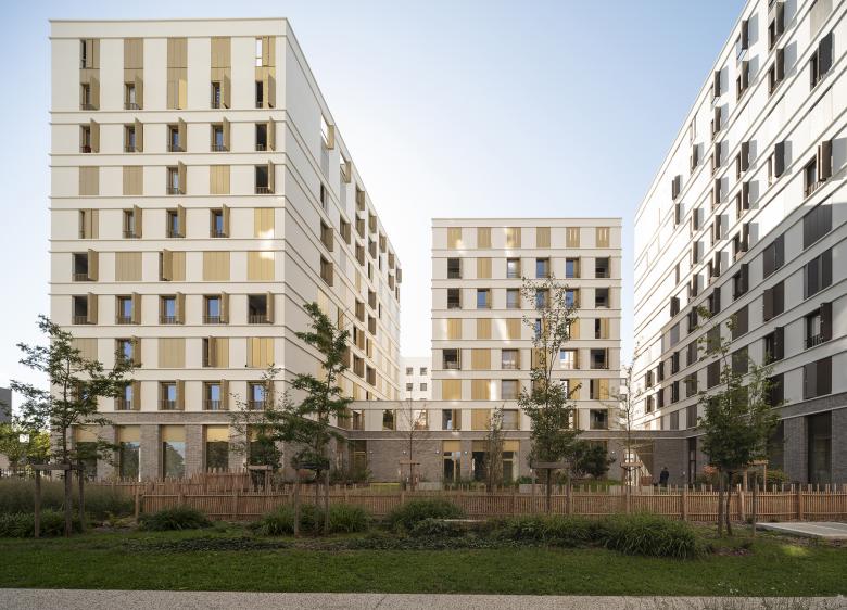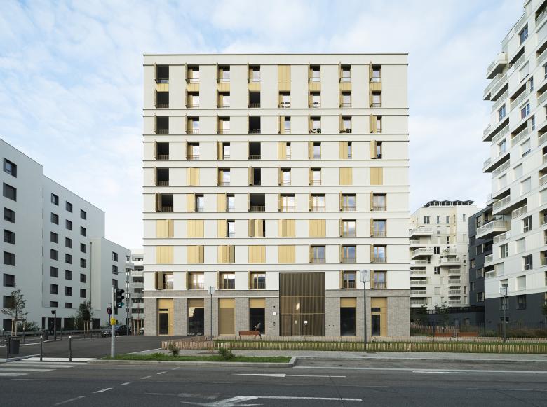 Die Ziele: In Villeurbanne, nahe Lyon, sollte ein soziales Wohnungsbauprojekt entstehen, das auf die sozialen wie städtebaulichen Herausforderungen des Standorts reagiert und seinen Bewohner*innen einen Ort des Wohlbefindens und der Identifikation bietet. Die Umsetzung: Entstanden ist eine urbane Skulptur aus drei verschiedenen Volumina, die sich entlang der Jacquard-Promenade und um den zentralen Garten entwickeln. Dieses Spiel der Volumina schafft eine spezifische architektonische Form; die Silhouette des Entwurfs verleiht dem Block Kohärenz – unterstützt von visuellen Verbindungen, Fassadenkontinuitäten sowie Schnittstellen zum öffentlichen Raum. Die Merkmale: Wesentlich für das Konzept ist das Verständnis des Außenraums, um den herum die Programmelemente integriert sind. Neben dem zentralen Garten als Gemeinschaftsraum bieten bepflanzte Dachterrassen großzügige Räume. Die Anordnung der Primärstruktur und der Kerne erlaubt eine hohe Nutzungsflexibilität – mitentscheidend für die Langlebigkeit und nachhaltige Entwicklung der Gebäude. Die kompakten Volumina sind ökonomisch wie ökologisch vorteilhaft, zudem verbindet das innovative Fassadenkonzept Wohnkomfort mit Energieeffizienz.