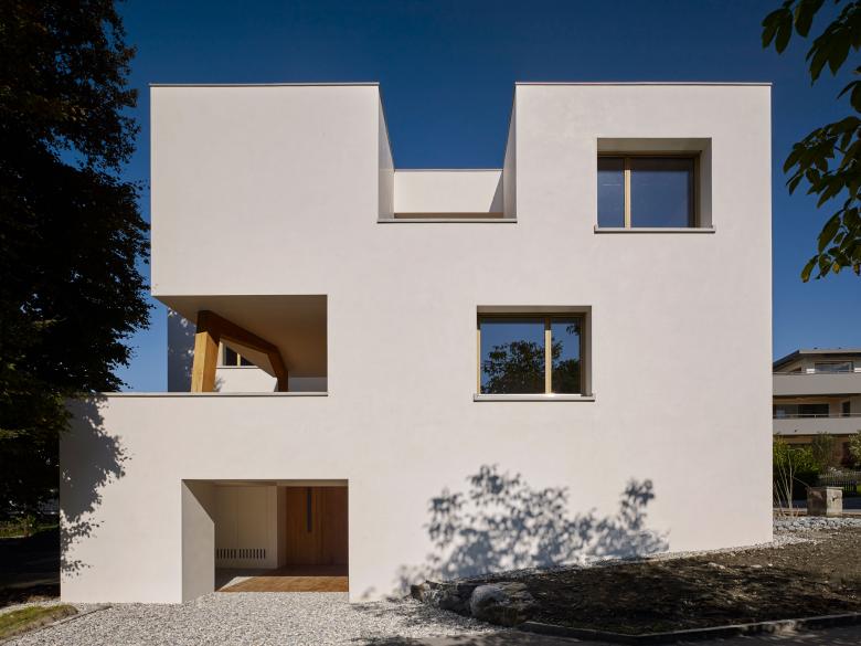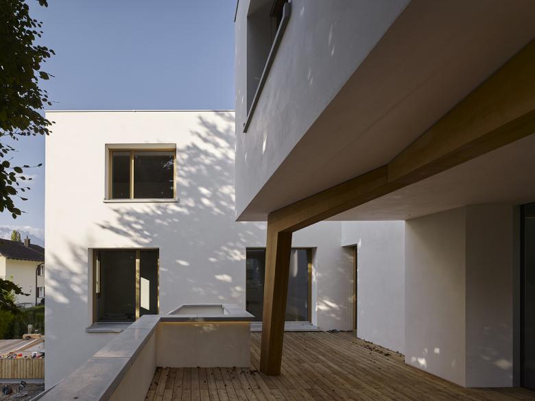 Das Haus Holdergasse in Vaduz zeigt auf prägnante Weise, was die Architektur als Mehrwert zu bringen vermag. Zunächst einmal wurde der Baukörper punktgenau auf dem knappen Grundstück positioniert. Er ist mehr als ein Volumen auf der grünen Wiese. Er eröffnet den Dialog zur Umwelt. Aus der Logik des Ortes ergab sich eine L-förmige Anordnung der beiden Gebäudetrakte. Es entsteht der überschaubare Innenhof als eigener Lebensbereich mit unmittelbarem Bezug auf einer starken Rotbuche. Ebenso erhält das Haus eine klare Straßenseite mit gedecktem Eingang und zwei geschützten Terrassen. Auf diese Weise werden angemessene Privatheit und der Bezug zum Quartier und der eher ländlichen Umgebung sehr differenziert miteinander verwoben.