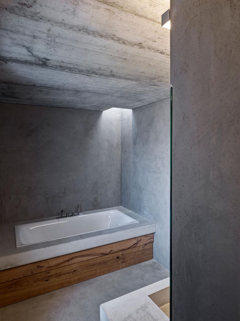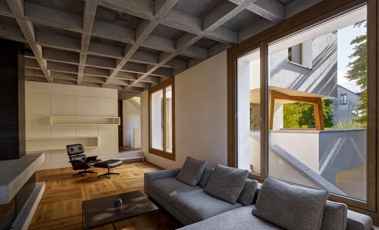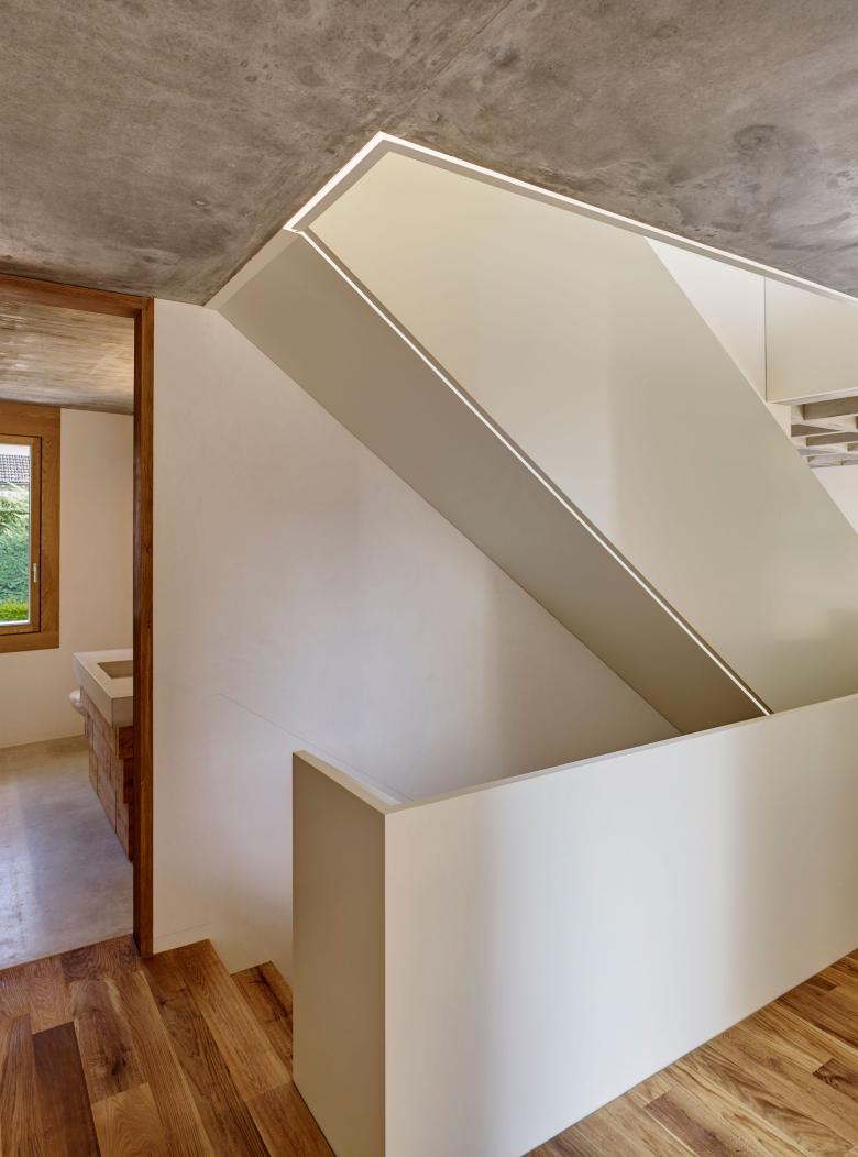 Innen kommt der unbehandelte Ortbeton verstärkt zum Einsatz. Die Kassettendecken im Wohnzimmer und der Essküche, die Decken im Treppenhaus sowie die Wände in den Badezimmern bringen einen raueren, dunkleren Akzent ein. Symbolisch betrachtet bringen sie uns näher zur Erde, konkret zeigen sie den statischen Aufbau: Ziegelwände und Betondecken bilden die Primärkonstruktion des Hauses.