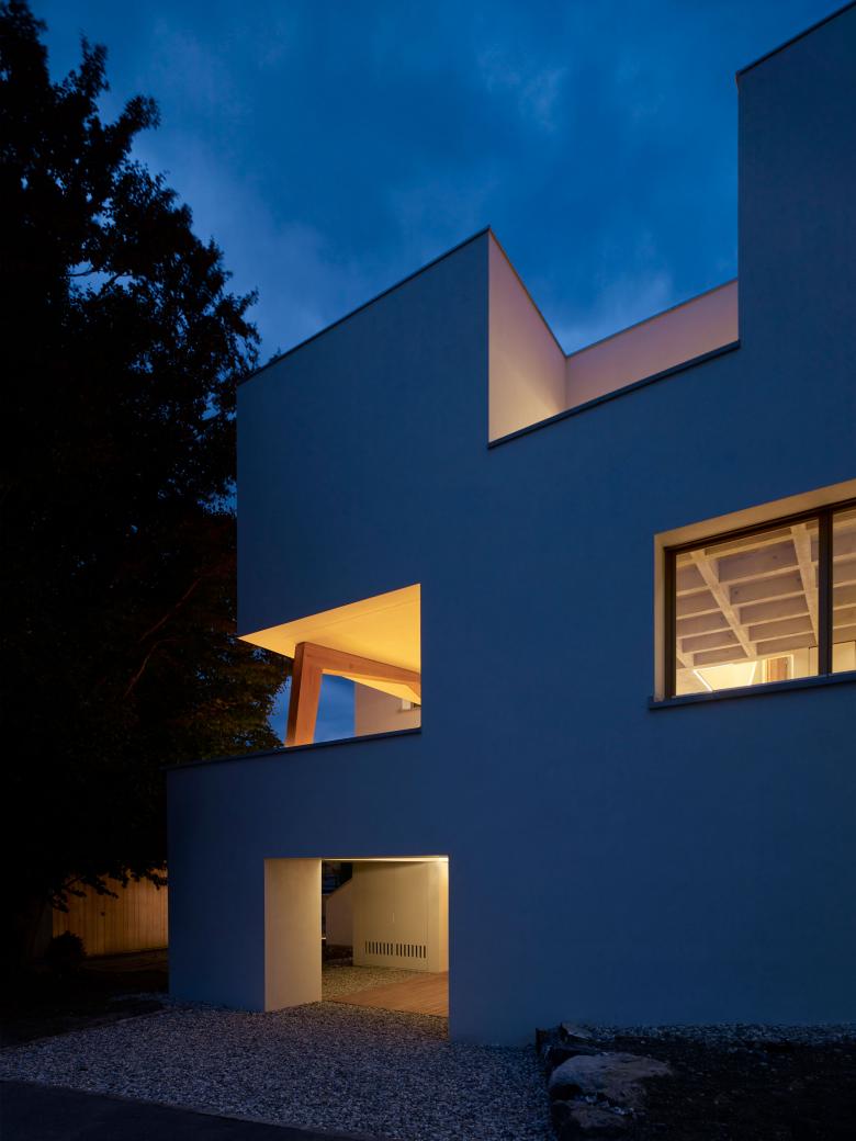 Aus diesem Dialog entsteht eine starke plastische Form, die alles andere als konventionell ist. So schwebt etwa an der Straßenseite das oberste Geschoß in Teilen über der Terrasse des ersten Stockwerks, dezent gestützt von einem trapezförmigen Holzträger. Im Parterre entsteht ein Eingangsbereich, der die Urformen des Bauens – Höhle und Zelt – thematisiert, während die asymmetrische Anordnung der Fenster – funktionell logisch – mit der Etikette klassischer Villenarchitektur bricht.