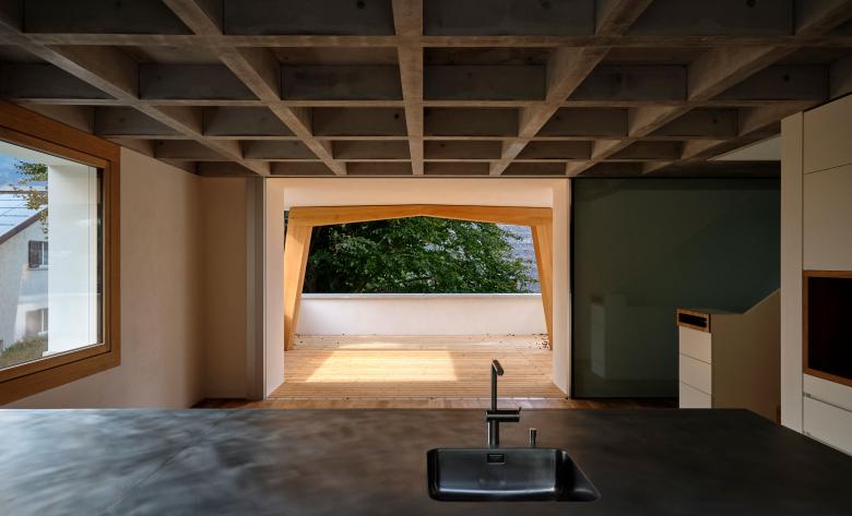 In der gesamten Konzeption des Hauses stand die Dauerhaftigkeit und damit Nachhaltigkeit der Materialien im Fokus. Die raumprägenden Kassettendecken in Küche und Wohnzimmer sind das Ergebnis eines Ansatzes die Betondecken auf die minimal notwendige Stärke zu reduzieren und damit Ressourcen zu schonen. Hohe Ingenieurkompetenz umgesetzt mit handwerklicher Fertigkeit resultieren in einer Deckenstärke von lediglich 8 Zentimeter in den Kassettenfeldern. Ästhetik und Funktionalität finden also zueinander. Die Dämmziegel aus reinem Ton reduzieren die Energieverluste auf ein Minimum. Zusammen mit den Betondecken generieren sie eine hohe Speichermasse, die solare Energiegewinne speichert und auch im Sommer ein angenehmes Raumklima gewährleistet. Die Wärmeerzeugung erfolgt über eine Luft-Wasser-Wärmepumpe.