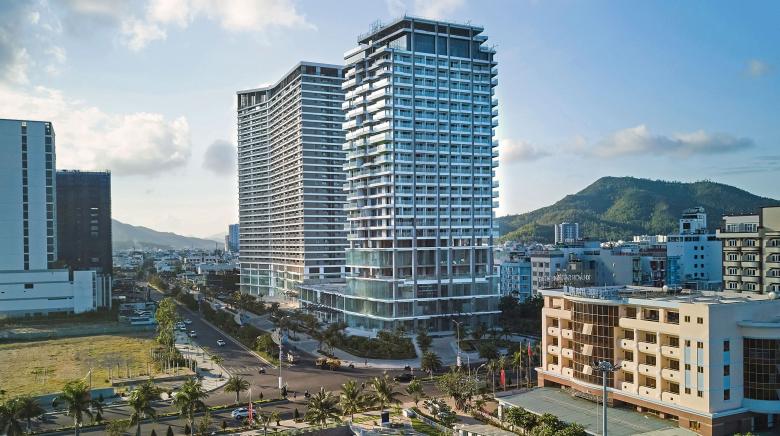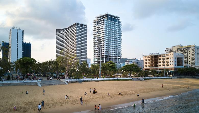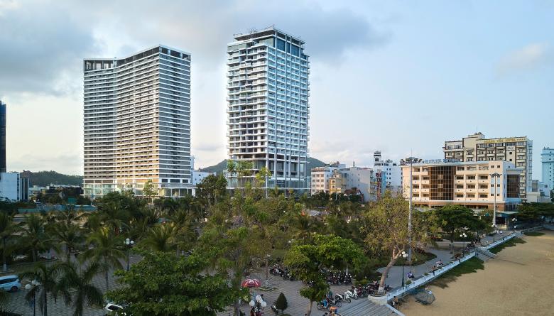 Unser Büro in Hanoi hatte als Design-Team kürzlich das Vergnügen, an der Eröffnung eines neuen gemischten Gebäudes in Quy Nhon teilzunehmen - einer Stadt, die eine Flugstunde nördlich von Ho-Chi-Min-City liegt. Das "FLC City Hotel Beach Quy Nhơn" liegt strategisch günstig im Zentrum von Quy Nhon und bietet einen herrlichen Blick auf die Strandpromenade. Die beiden Hotels - Novotel und Seatower - befinden sich im selben Straßenblock und bieten ein gemeinsames Einkaufszentrum in den ersten beiden Stockwerken. Da sie sich in zwei getrennte Türme aufteilen, wird der Raum dazwischen in ein begrüntes Dach umgewandelt, um mehr öffentlichen Raum für Einkäufer, Anwohner und Hotelgäste gleichermaßen zu schaffen. Eine weitere Besonderheit des gesamten Komplexes ist eine unterirdische Bar, die durch einen Tunnel vom Hotel aus zu erreichen ist und sich direkt am Strand befindet.