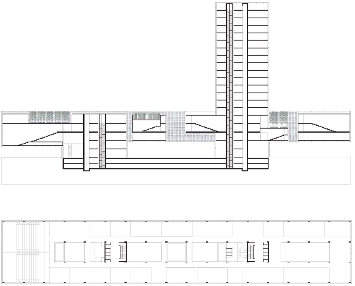 Gestützt auf zwei Betonkerne mit den Eingangszonen spannt das Haus die Dimensionen von Höhe und Breite auf. Für das subjektive Gefühl des Schwebens sorgen Fachwerkkonstruktionen, die ab der zweiten Etage auskragen. Städtebaulich wird damit die Durchlässigkeit zu den Freiräumen für die Bibliotheks- und Institutgebäuden im Süden erzielt. Die „Maison du Savoir“ stellt also urbanen Kontext und Kontinuum her, ohne deswegen seine solitäre Position aufzugeben. Wie Martin Heidegger einmal geschrieben hat: „Erst durch die Brücke, die den Fluss verbindet, entsteht ein Ort“. Ein Ort, der auch in seinem Inneren mit hohen Qualitäten aufwarten kann. Die „Stadt in der Stadt“ wird hier Programm, ergänzt durch die große Dimension. Die beiden zweigeschossigen Auditorien schweben an den Ecken des horizontalen Balkens über dem Boden und erfüllen damit den Anspruch der Architekten.