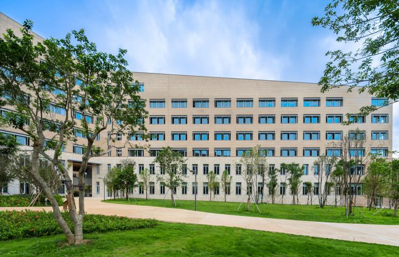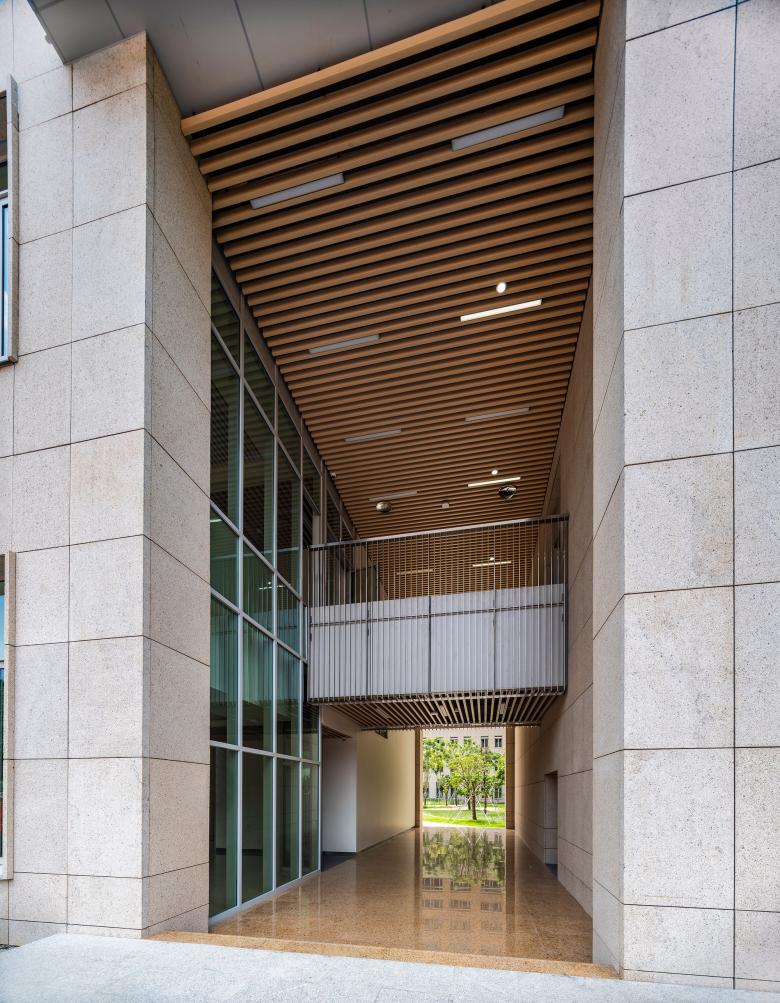 Den sensiblen Umgang mit dem Terrain reflektiert auch der Verlauf der Dachlandschaft. Von Norden und Westen abfallend, begleitet die Form der beiden Gebäude die Entwicklung des Geländes. Die Schule definiert einen neuen Ort auf dem Campus der South China Technology University, offen und kommunikativ. Die Architektur zeigt sich zurückhaltend – Fensteröffnungen und Wandflächen stehen im Dialog mit den beiden unterschiedliche Materialien der Fassaden.