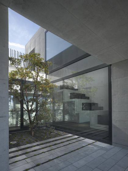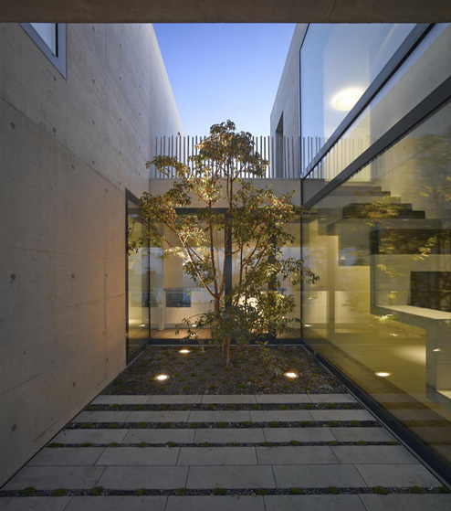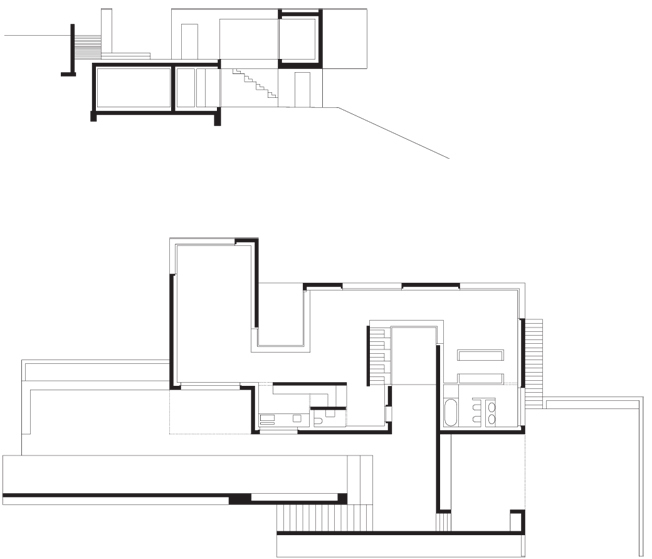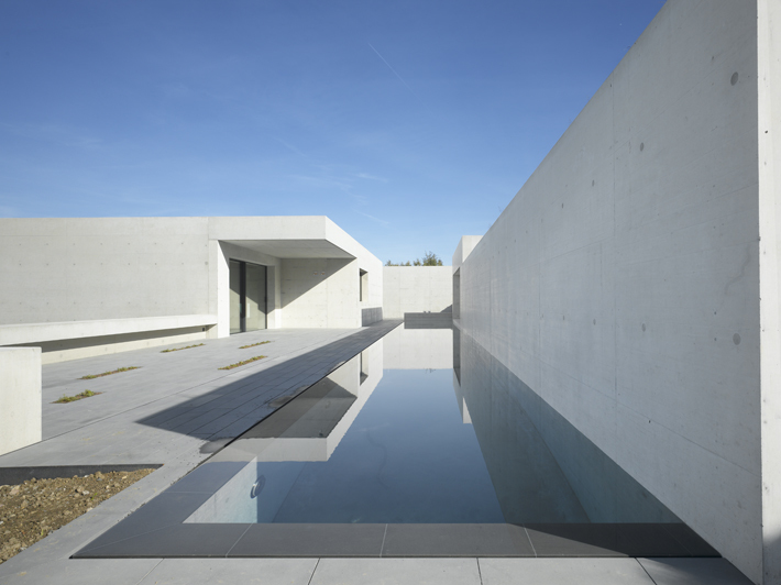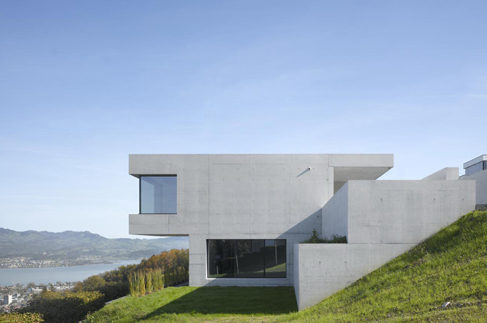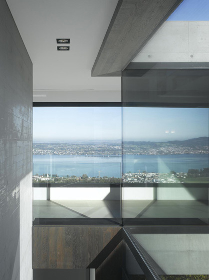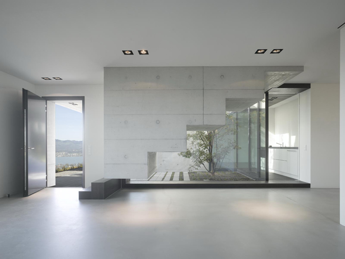 Das Grundstück befindet sich in einer Hanglage, sodass die Qualität der Interventionen auch die Topografie optimiert: Ein gemeinsames Atrium verbindet die beiden Geschoße, welche das Terrain besetzen. Raffiniert fasst der Baukörper u-förmig diesen Raum. Bedingt durch eine Brücke in der Eingangsebene eröffnet das Atrium den Blick vom Vorplatz –das Haus gleichsam im Schnitt zeigend - hinaus ins tiefer liegende Gelände. Ein weiteres baulich umschlossenes Atrium verstärkt die auskragende NW-Ecke, wo sich das Wohnzimmer befindet.