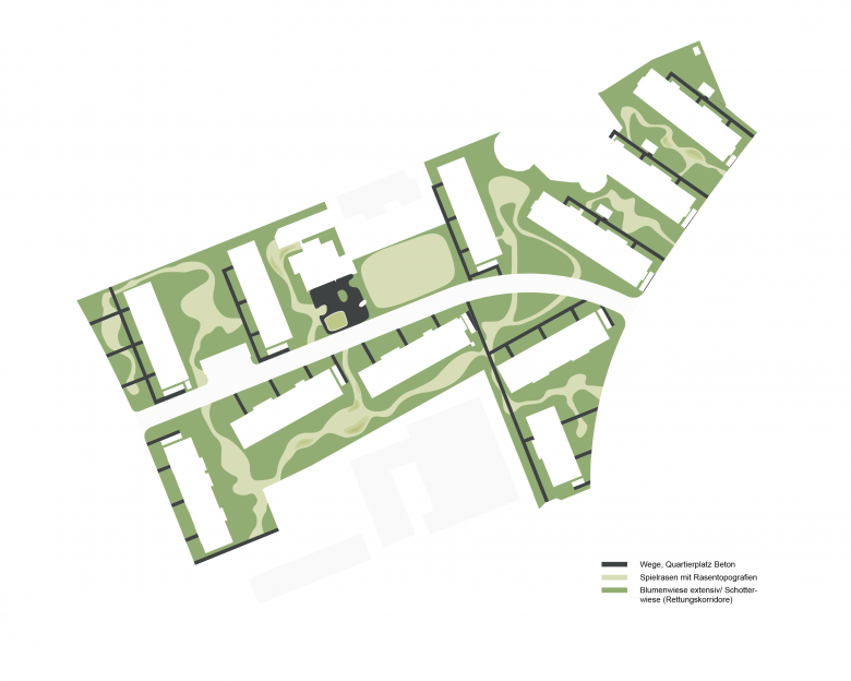 Ausgegangen wurde von einer Verwandlung der bestehenden Anlage mit ihren kurz geschorenen Rasenflächen und den stark gestutzten Gehölzen in eine urbane Wildnis, die grosszügig durch die Siedlung fliesst. Diese ökologische Grünmasse ist die Basis, das Bild, welche das Wohnumfeld fortan stark prägen wird. Erschlossen wird diese erlebbare Stadtnatur durch eine grüne, strapazierfähige Rasenfläche, die durch ihre mäanderartigen Wege einerseits die urbane Wildnis erschliesst, andererseits selbst zum Nutzungsraum wird.