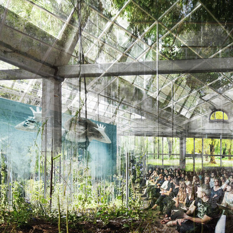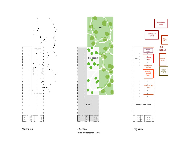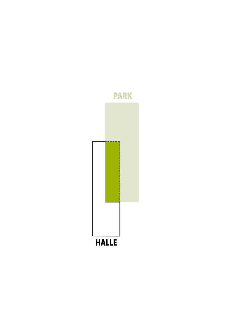 Aus dem künftigen, zentralen Parkteil und der bestehenden, historisch und strukturell wertvollen Shedhalle wird durch Überlagerung eine Schnittmenge gebildet. Es entsteht ein „Gartenraum“, eine Gartenhalle mit eigenem Klima, welche durch ihre neuen Öffnungen zur Parkseite in eine Beziehung mit Demselben tritt.
