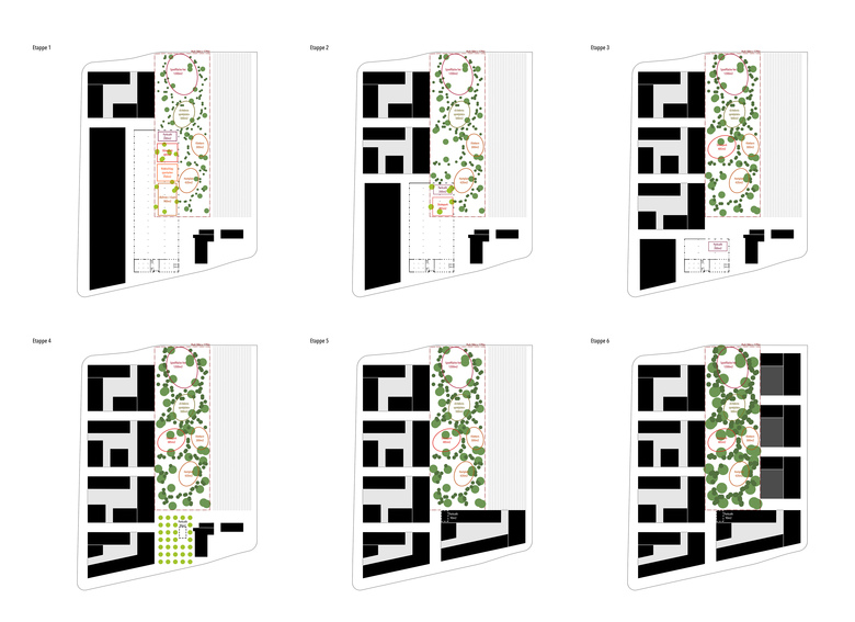 Durch den gegebenen Zeithorizont einiger Jahrzehnte ist es möglich, den Park räumlich wachsen zu lassen, indem kleine Bäume gepflanzt werden. Wachstum wird damit zum Programm, gleich dem „Wachstum“ der Siedlung. Die Wegstruktur kann von Beginn an gebaut werden, das Anfüllen der Parkräume mit teurer Infrastruktur erfolgt im Laufe der Zeit. Dieses Vorgehensprinzip erlaubt einen ausserordentlich effizienten Einsatz der Mittel, ohne dabei Qualität einzubüssen.