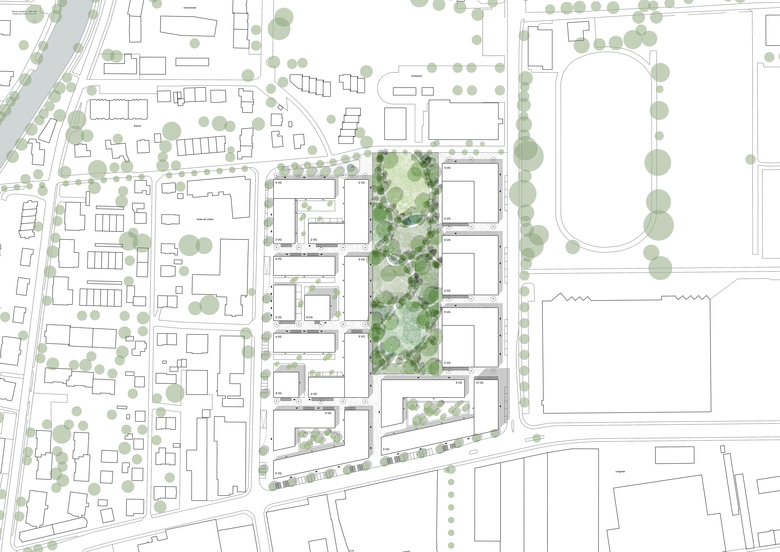 Tragende Basis des Parkkonzeptes ist die grünräumliche Struktur, welche durch Säulenbäume gebildet wird und ein Gegenüber zur architektonischen Säulenstruktur der Halle darstellt. Durch ihren Habitus und ihre Anordnung vermag sie Parkräume zu bilden, welche durch atmosphärische Solitärbäume akzentuiert werden. Die Säulebäume sind durch Ihre Verwandtschaft zu den Säulenpappeln der Carrés des 19. Jahrhunderts Vermittler, welche eine Wiedergeburt des aussergewöhnlichen, historischen Freiraumkonzeptes von Biel anstossen könnten.