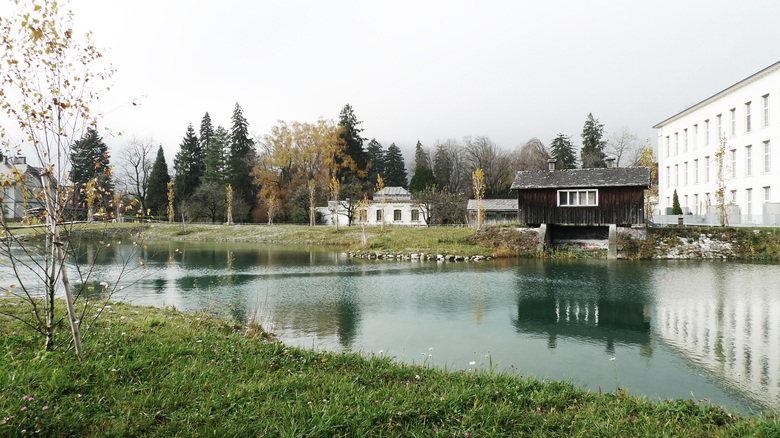 Der Untere Fabrikweiher steht in angrenzender Nachbarschaft zu Obstgarten und Villenpark, geplant von Evariste Mertens in der 2. Hälfte des 19.Jh.. Nordseitig wird der Weiherraum geprägt durch die Fassade des ehemaligen Fabrikgebäudes (heute Loftwohnungen) und ihrer Terrasse. Der Weiher muss als technisches Wasserbauwerk funktionieren (3-5 Entleerungen jährlich) und soll, gemäss der Tradition der künstlich angelegten Kanäle und Teiche zur industriellen Nutzung, auch ein dementsprechendes Gesicht erhalten. Landzungen strukturieren das Gewässer in 5 Kammern, die miteinander verbunden sind und die durch die entsprechende Geländemodellierung im Falle einer Entleerung Ihr Wasser innert kurzer Zeit an das alte Gerinne abgeben. Wasserfassende Rückzugsmulden in Flachwasserbereichen ermöglichen Flora und Fauna in dieser Zeit ein Überleben. Durch die Art und Weise der Geländemodellierung entstehen Böschungen in verschiedenen Neigungen und Expositionen und damit vielfältiger Lebensraum, wo hohe Biodiversität erwartet werden kann. Ein vielfältiges, einheimisches Pflanzensortiment, bestehend aus Gehölzen, Wildstauden, Schwimmblattpflanzen und Wildblumenwiese bildet dafür die Grundlage. Die Loftbewohner erleben den Wasserpark über den leicht erhöhten Holzsteg, welcher vom gemeinschaftlich genutzten Obstgarten ausgehend, der neuen Topographie folgend, über dem Wasser schwebend als Plattform endet. Die Gehölzpflanzung unterstreicht die topografische Vorgabe und reagiert durch Ihr Setzungsprinzip auf die engen Platzverhältnisse; gleichzeitig lenkt sie den Blick. Jahr für Jahr wird das Raumgebilde durch Wachstum stärker. Die ganze Anlage wurde ausschliesslich mit vorhandenen Materialien vor Ort erstellt, was sich ausserordentlich positiv auf Ökologie und Ökonomie auswirkt.