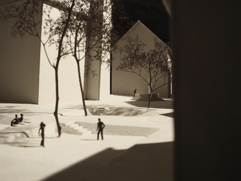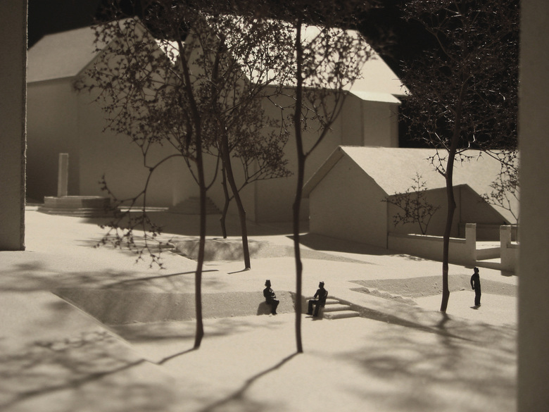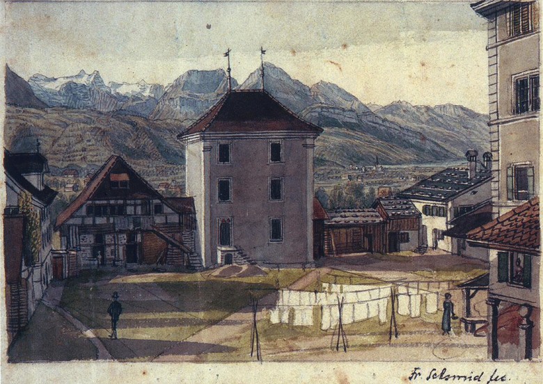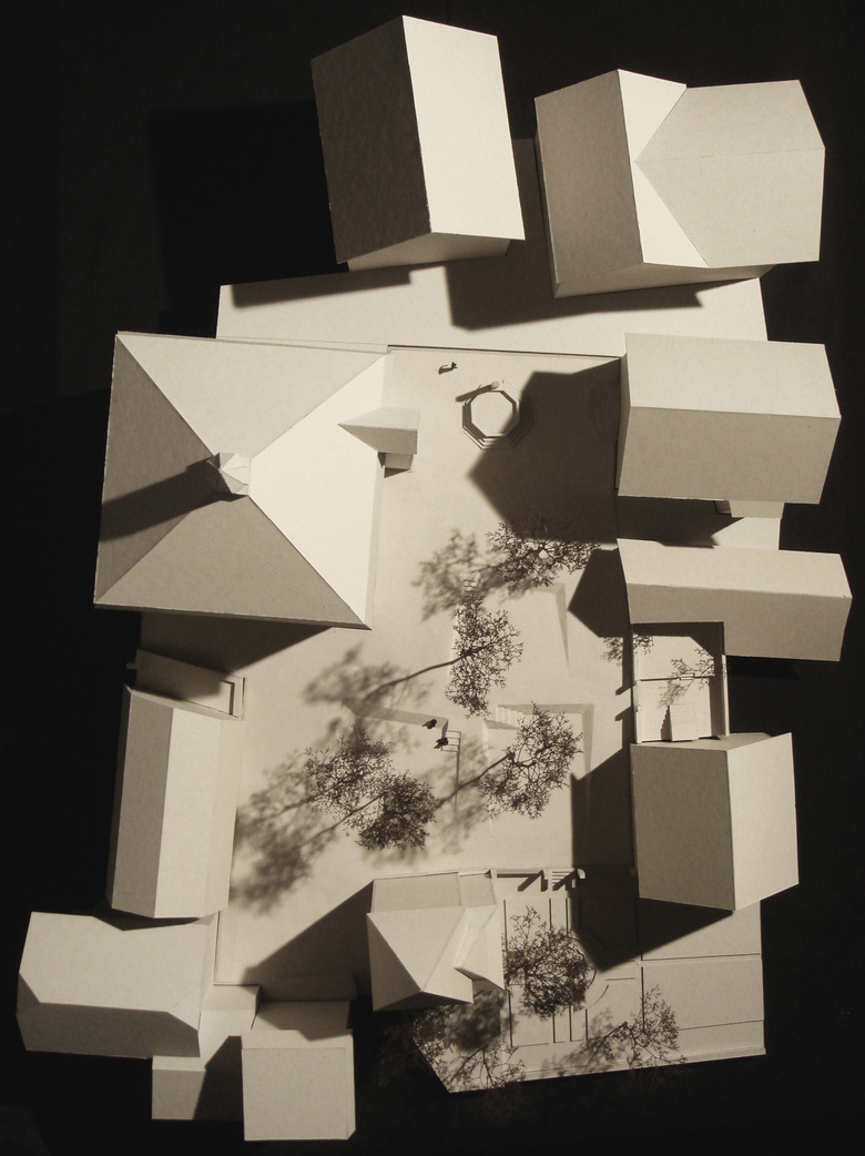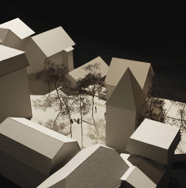 2. Der pragmatische Teil: Beibehalten der bewährten Wege, die die Bewohner von Schwyz seit Jahrzehnten oder Jahrhunderten gehen. Sie verbinden Platzöffnungen, Gassen und Hauseingänge auf kürzestem Weg über die schiefe Ebene. Auf den „Restflächen“ entstehen ebene Nischen, die in die schiefe Ebene einschneiden als wichtige Plätze des Aufenthaltes.