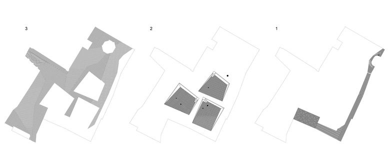Ausgehend von der bestehenden historischen Pflästerung vor den Hauseingängen wird das „Natursteinpflastergewebe“ weitergestrickt (1). Die 3 Plätze werden in Reihen, mit vorhandenen, halbierten Rundsteinen versehen und durch grosse, geschliffene Blöcke des Schwyzer Alpenkalks gestützt. Wildkirschen spenden Schatten (2). Bewegte Pflastersteinreihen zeichnen die abstrakten Höhenlinien der schiefen Ebene. Sie vermitteln zwischen den Elementen (3).