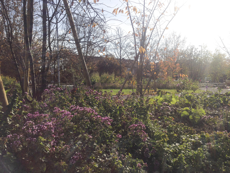 Ein besonderes Schmuckstück stellt der erhöhte und gefasste Gartenraum im Eingangsbereich dar. Die verwendete Vegetation von Duft,- Heil und Kräuterstauden im Zusammenspiel mit schattenspendenden Gehölzen bietet über alle Jahreszeiten hinweg einen hohen Zier- und Aufenthaltswert.