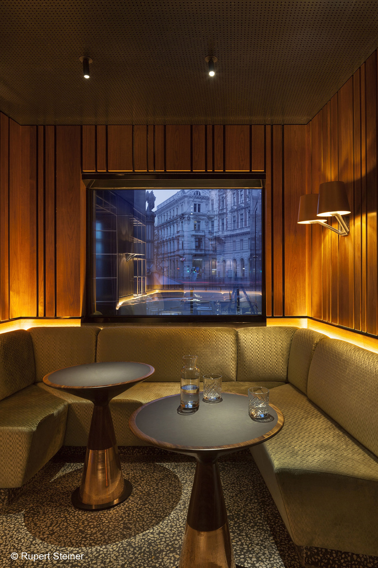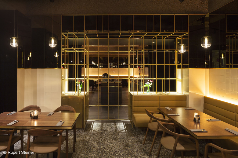 From here, one can reach a former “kitchen” that is now a simple dining area featuring bright tiles, and dark bands of bronze-toned mirrors which maximise the illusion of depth and create an additional feeling of space. Floor-to-ceiling windows allow views into the gastronomic life of Wiedner Hauptstrasse.