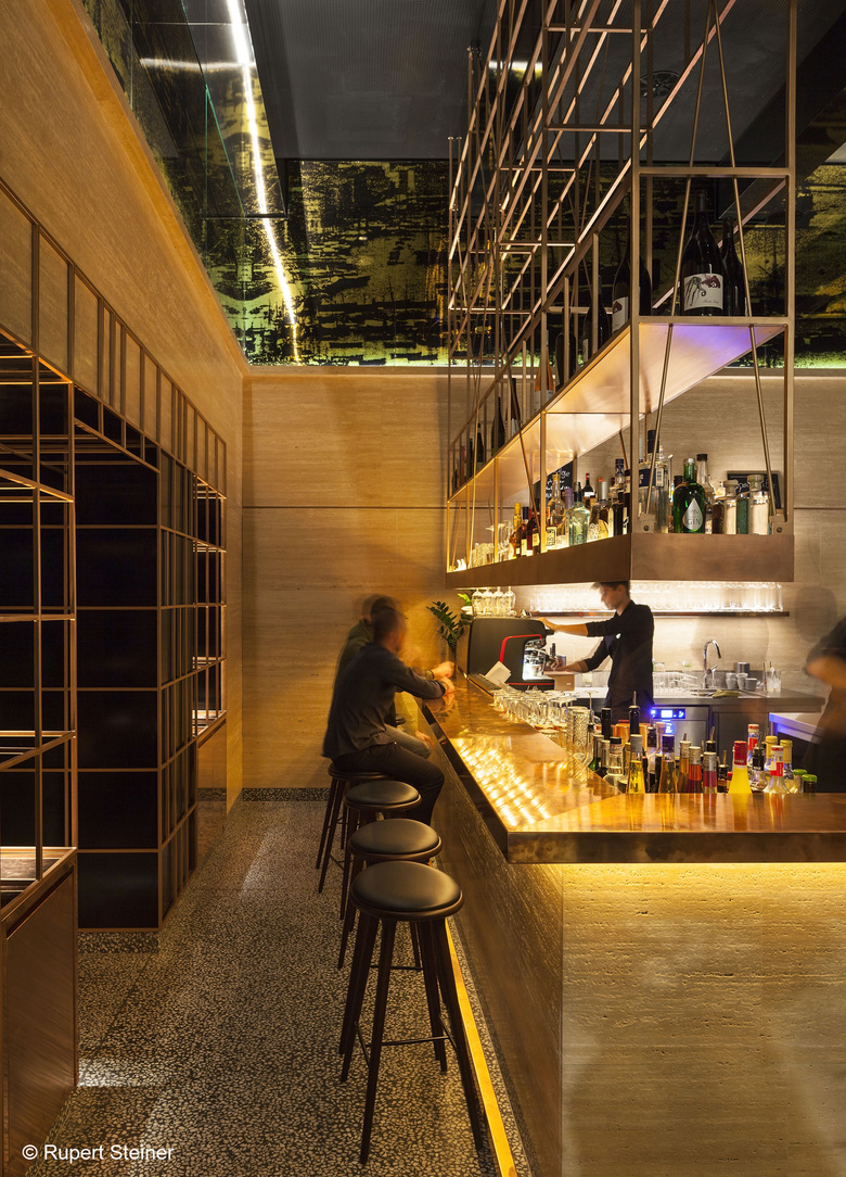 Guests coming from Rilkeplatz, enter the main room of Porto Bar through a cubic copper-covered door. The walls of the room are clad in simple and quiet, yet high-quality continuous travertine stone which extends up to the ceiling. Slender bands of mirror that reflect historic photos of the harbor of Trieste add the finishing touch to the unique ambience. In order to implement the objectives of the interior spatial acoustics, the ceiling is perforated, fitted with black sheets with mirror effect and divided by longitudinal beams. The height of the room is emphasised by a copper-shelf, hanging free from the ceiling.