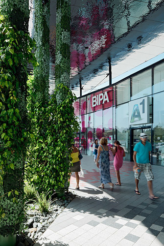In the case of the shopping boulevard and the slim pillars of the canopy, the concept of the thoroughly landscaped outside areas is implemented by the use of climbing plants. These “green” pillars below the shiny canopy create a unique, lively and relaxing atmosphere. The visitors feel like they are walking through the green oasis.