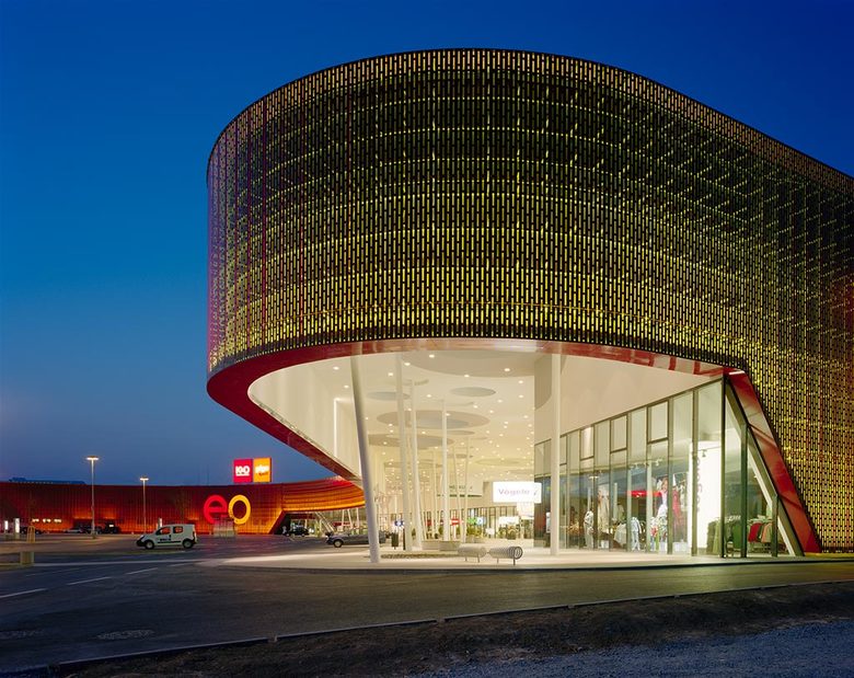 The round and smooth shape of the building fits harmoniously into the surrounding environment. The parking spaces have been arranged so that each shop is within short reach. Different shape and colour concepts draw attention to the variety and quality of shops and gastronomic establishments on offer.