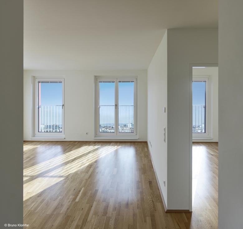 The highest point of the complex on the corner of Erdberger Lände / Drorygasse expresses itself clearly as a strong architectural signal within this new urban destination in Vienna.