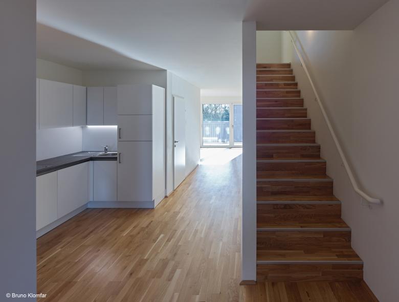 The building on the adjacent plot 9 is divided, above the two-storey plinth, into two individual building units. The open spaces between the two units dissolve the perimeter block housing and enable stringent floor plans.