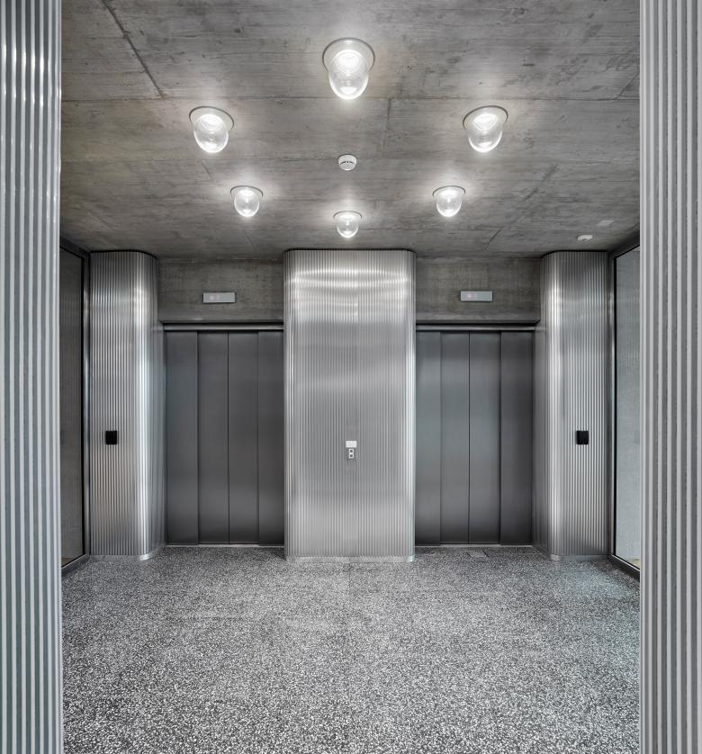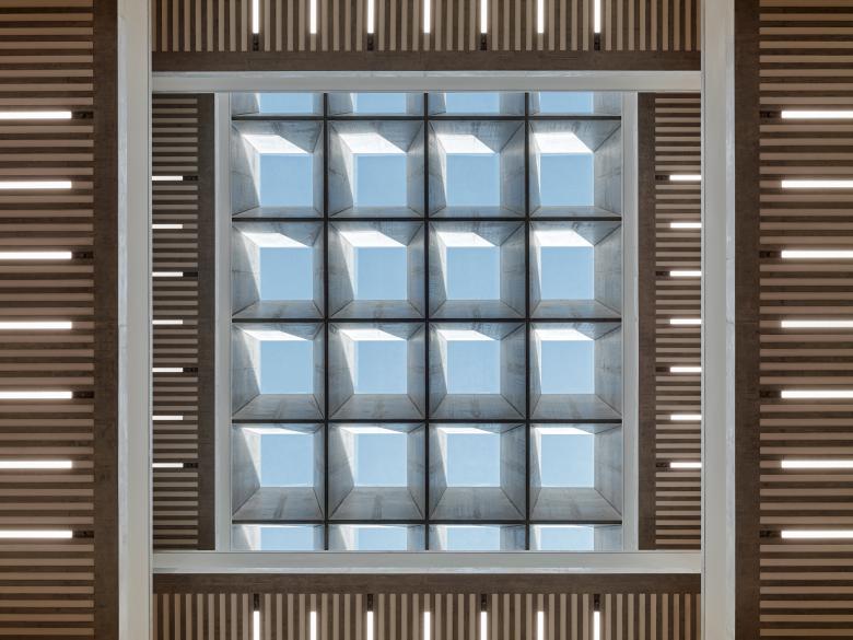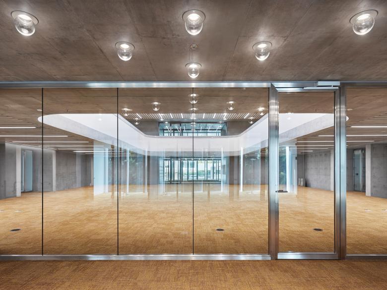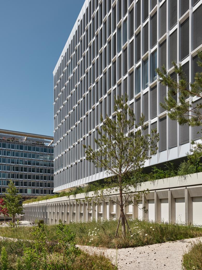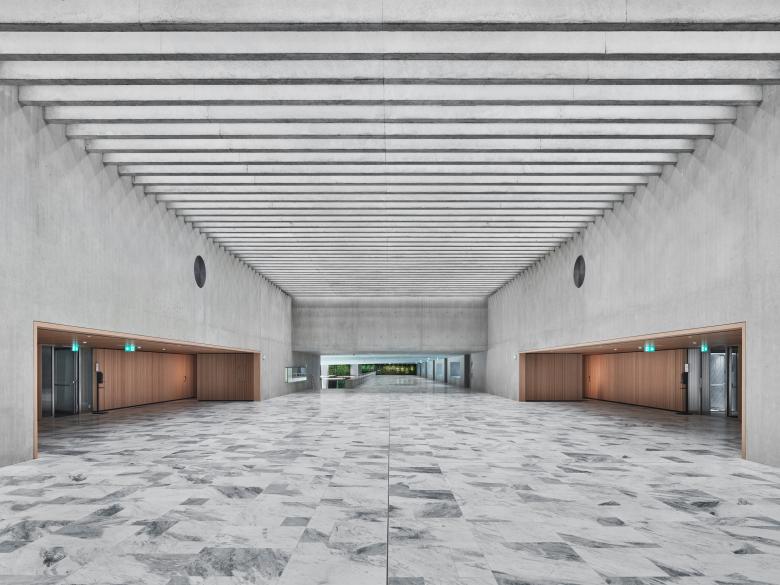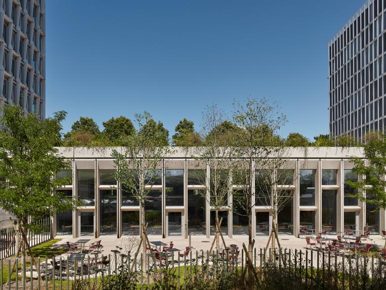 Der neue, langgezogene Betonsockel mit seinen grossen Fensterbändern verbindet alt und neu. Er wird zum Zentrum der gesamten Anlage. Die Geschossstruktur vom Tschumi-Bau aufgreifend, setzt sich die logistische und funktionale Verflechtung des Bestandes auch im Inneren des neuen Sockelbaus fort. In ihm sind Gemeinschaftsräume wie das Restaurant und die Konferenzsäle untergebracht. Darüber befinden sich eine Terrasse und das würfelförmige Hauptvolumen. Äusserlich streng gegliedert, ist dieser neungeschossige Administrationstrakt im Inneren offen und flexibel. Ein durchgehendes Atrium im Zentrum bringt Tageslicht ins Innere und ermöglicht Blickbeziehungen durch den ganzen Turm.
