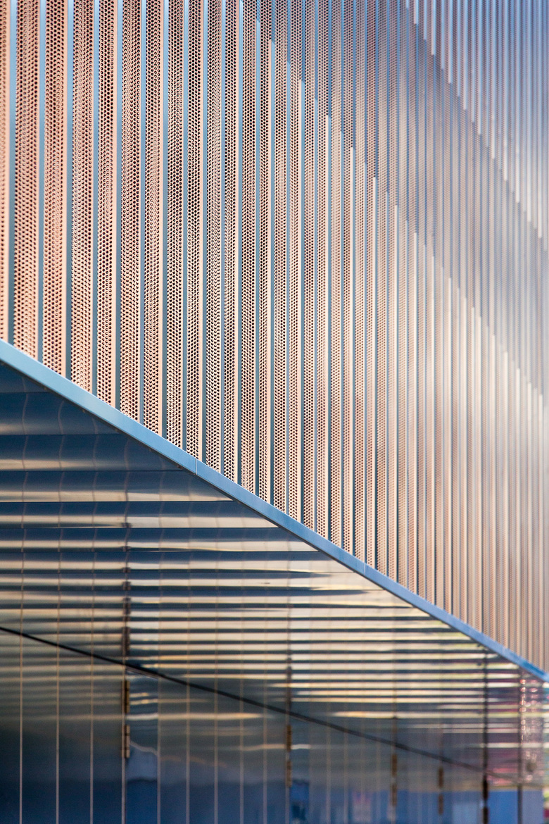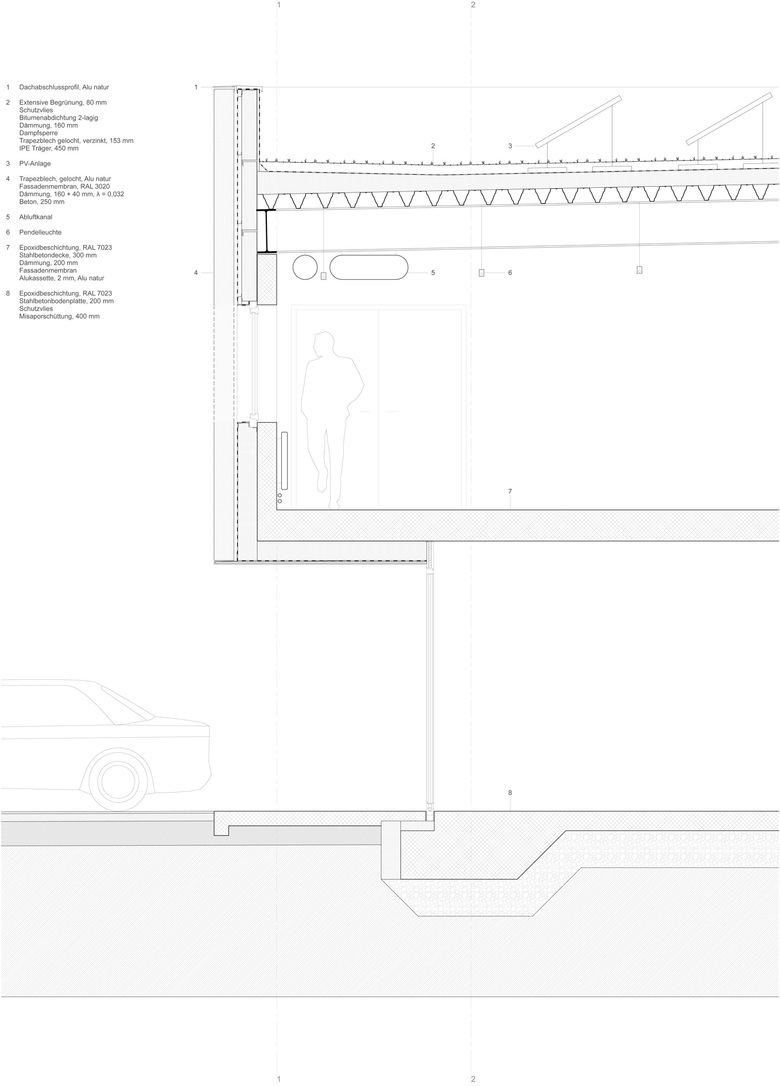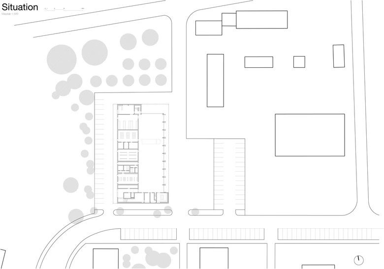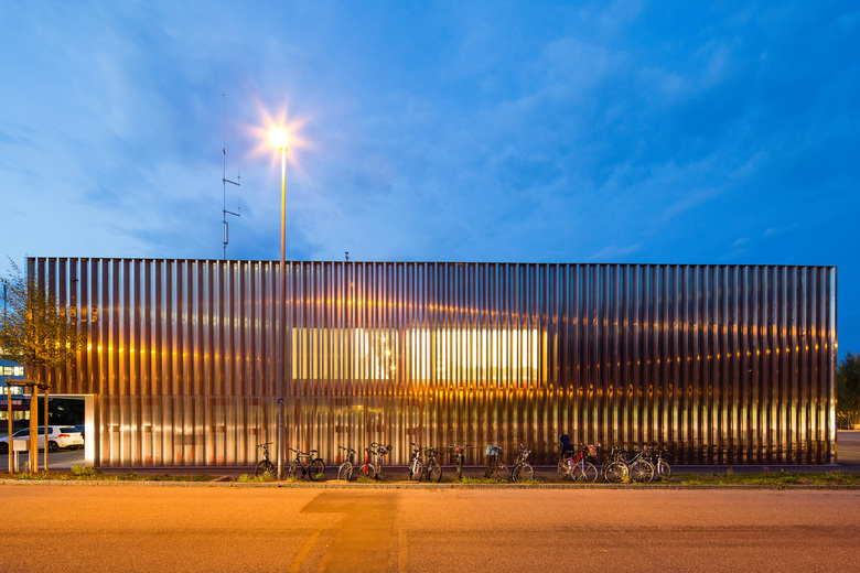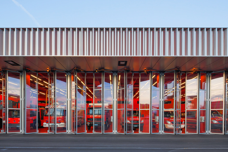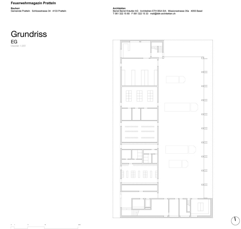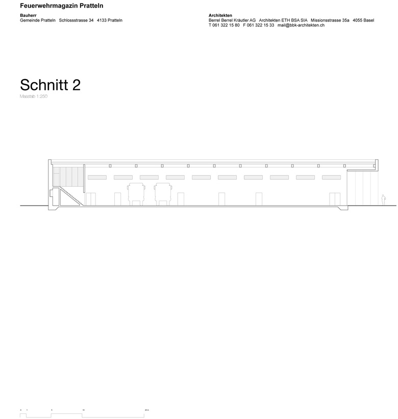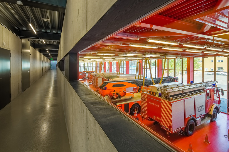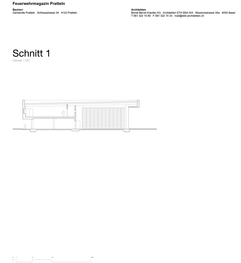 Hervorgegangen aus einem Wettbewerbserfolg im Jahr 2010 wurde das neue Feuerwehrmagazin in Pratteln im Oktober 2013 nach einjähriger Bauzeit fertiggestellt. Der flache Neubau befindet sich am westlichen Ortsrand im Schnittstellenbereich von Wohn- und Gewerbegebiet. Als neuer Baustein in einem grobmaschigen Netz heterogener Gebäudevolumen, gliedert sich der skulpturale Körper sinnvoll in die durchgrünte Umgebung ein. Die einfache aber effiziente Organisation im Inneren ist Taktgeber für seine äussere Erscheinung. Durch die Verzahnung zweier unterschiedlicher funktionaler Nutzungseinheiten entsteht ein spannender architektonischer Dialog. Die sich nach aussen öffnende Einstellhalle wird umschlossen von einem zweigeschossigen, winkelförmigen Infrastrukturteil. In diesem Rückgrat befinden sich im Erdgeschoss direkt von aussen erschlossen die einsatzrelevanten Räume. Im oberen Gebäudeteil sind Büroräume, die Einsatzzentrale und ein grosser Versammlungsraum untergebracht. Die vertikale Erschliessung erfolgt über zwei Treppenanlagen, jeweils am nördlichen und südlichen Gebäudekopf gelegen. Beinahe symmetrieaxial befindet sich im oberen Geschoss der von einem Oberlichtband begleitete Erschliessungsgang von welchem man einen Einblick in die Fahrzeughalle hat. Die Fassade aus vertikalen, perforierten Metallelementen, bekleidet das Gebäude wie ein schimmernder Vorhang. Fensteröffnungen befinden sich diffus verschleiert in der zweiten Fassadenebene. Eine Entscheidung für die gewählte Materialisierung ergab sich in Anlehnung an die industriell geprägte Nachbarschaft. Die unverhüllte Glasfassade der Einstellhalle hingegen ermöglicht einen Einblick von aussen. Kräftiges, mattes Rot, bietet im Inneren der Feuerwehrzentrale einen farblichen Kontrast zum schillernden Metall der Aussenhaut und betont als optisches Signal die Nutzung. Neben der intensiven Auseinandersetzung mit organisatorischen und ablauforientierten Lösungen, wurde besonders auf eine kostengünstige Realisierung hingearbeitet. Durch die Verwendung von einfachen möglichst unbehandelten Materialien, wird sowohl der industrielle Charakter des Gebäudes betont, als auch ein ehrgeiziger Finanzierungsrahmen nicht überschritten.