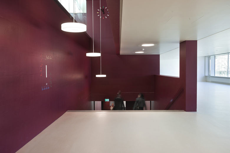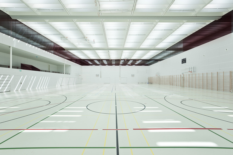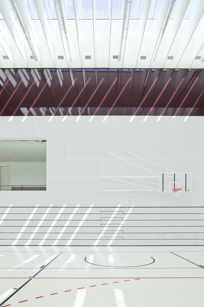 Das Erdgeschoss ist über zwei diagonal versetzte Haupteingänge auf Ost- und Westseite zugänglich. Die Dreifachturnhalle bildet das Herz des Neubaus. Um die Turnhalle herum, befindet sich eine raumhaltige Schicht mit Schulkantine und Garderoben. Über zwei breite Kaskadentreppen wird das Gebäude vertikal erschlossen. Im Windmühlenprinzip um die Halle organisieren sich in den oberen Geschossen sämtliche Klassen- und Unterrichtsräume. Die sich örtlich zu Pausenräumen aufweitenden und in jede Himmelsrichtung nach außen öffnenden Erschließungsflächen haben eine hohe Aufenthaltsqualität und verweben sinnvoll die Hauptnutzungen miteinander. Sichtbeziehungen quer durch die mit Tageslicht durchflutete Halle sowie zwischen den Geschossen, lassen das Gebäude zu einer gut organisierten Einheit verschmelzen. Die im Grundriss ablesbare Gliederung in Funktionsschichten wird räumlich durch das Farb- und Materialkonzept erlebbar. Kommunikations- und Verbindungszonen sind vorwiegend in dunkelrot gestaltet und signalisieren Ruhe und Intimität. Innerhalb der Klassenräume sind die Flächen hauptsächlich hell und offen gestaltet. Die mittig eingebettete Sporthalle ist ausschließlich in Weiß gehalten und reflektiert das über die Oberlichter einstrahlende Licht in die Gangbereiche. Turnhalle und Klassenräume als Orte des Hauptbetriebs, mussten aus akustischen Gründen umlaufend mit speziellen Paneelen ausgekleidet werden. Das Tragwerkskonzept basiert auf der Ausbildung einer Megastruktur. Die im zweiten Obergeschoss regelmäßig vorkommenden Schulzimmertrennwände bilden zusammen mit den darüber und darunter liegenden Decken ein steifes System. Innerhalb der Decken herrscht eine radiale Zug- bzw. Druckbeanspruchung, welche die Turnhallenaussparung in der Gebäudemitte umströmt und auf diese Weise einen globalen Zug- bzw. Druckring bildet. Zur Minimierung von Verformungen sind hoch Zug beanspruchte Zonen mit Spannkabeln vorgespannt. Das erste Obergeschoss ist an die darüberliegende Struktur angehängt und kann somit flexibel für Stützen- und Wandfreie Funktionen genutzt werden.