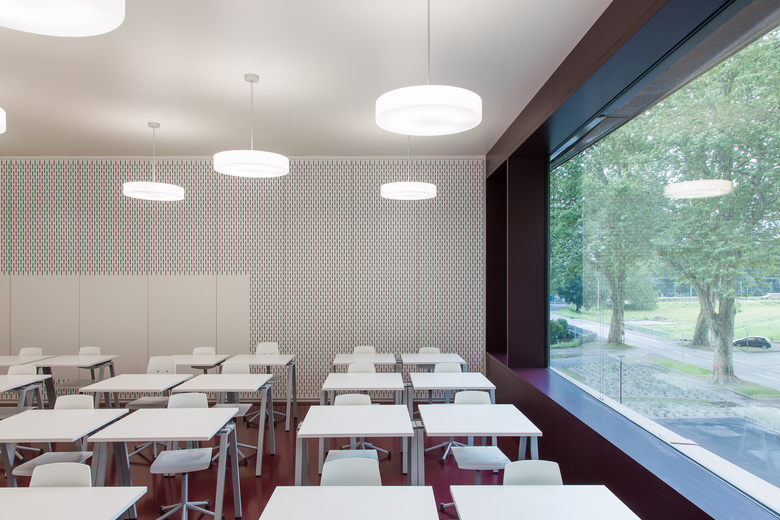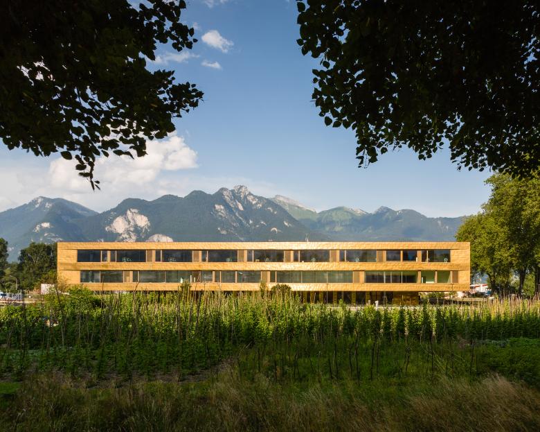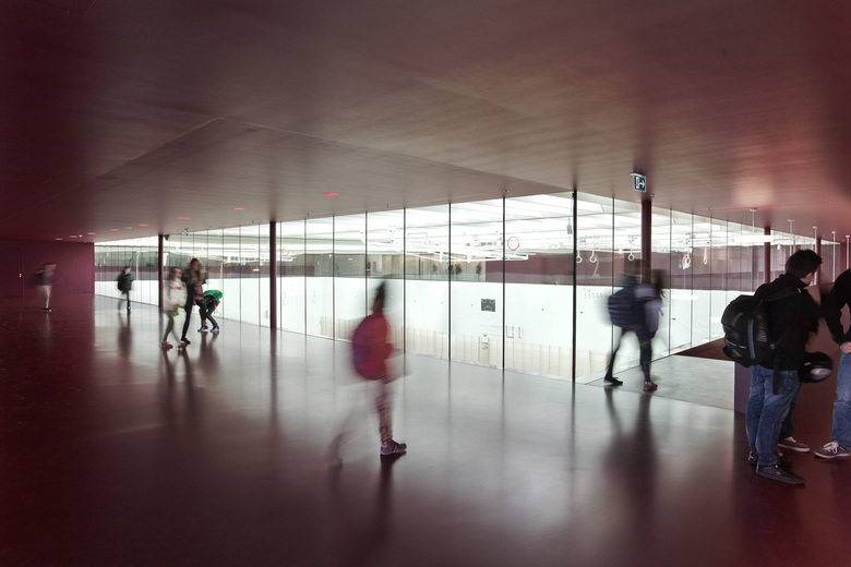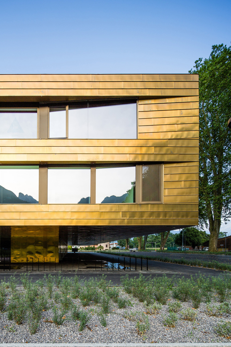 Das neue Schulhaus der Gemeinde Vouvry befindet sich auf einem ebenen Grundstück zwischen historischem Dorfkern und Rhône. Der Blick auf das Gebäude wird im Hintergrund begleitet von der Silhouette der Walliser Alpen. Die Besiedelung des Rhônetals ist geprägt durch großmaßstäbliche Gewerbebauten. Wie selbstverständlich fügt sich das neue Volumen, in welchem die Funktionen Lehr- und Sportbetrieb unter einem Dach vereint sind, in diese Bebauungsstruktur ein. Eine Haut aus Kupfer-Messingblech überzieht die homogene Struktur, in der sich diffus die grünraumgeprägte Umgebung widerspiegelt. Die traditionelle Verarbeitungstechnik der gefalzten Fassade wurde bewusst gewählt, um eine zu massige Gesamterscheinung zu vermeiden und einen willkommenen Kontrast zur rigiden Großform zur erzeugen. Die Fensterfront der beiden oberen Geschosse ist als Bandfassade ausgebildet und im Grundriss mit flachem Winkel nach innen versetzt. Im zurückspringenden Eingangsgeschoss ist die Fassade vertikal gegliedert und vermittelt durch hohe Transparenz einen einladenden Eindruck. Da die Obergeschosse umlaufend acht Meter weit auskragen, wird dort ein überdachter Begegnungs- und Aufenthaltsraum geschaffen.