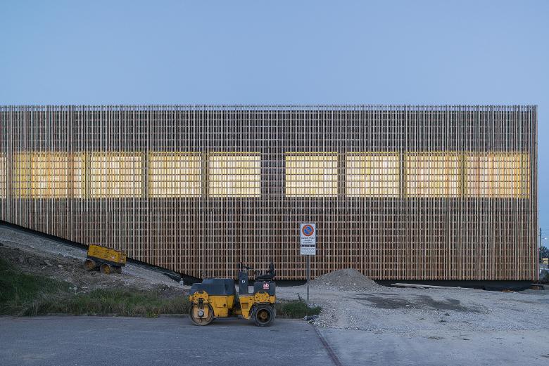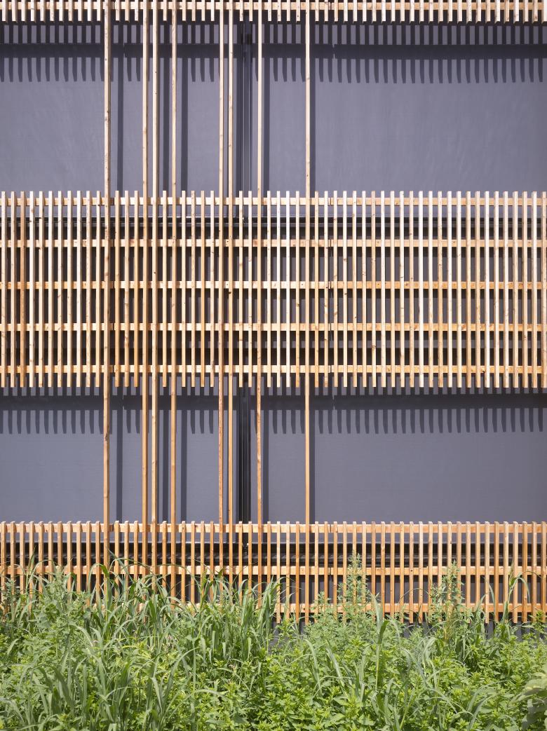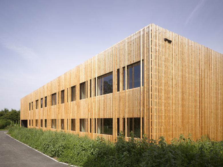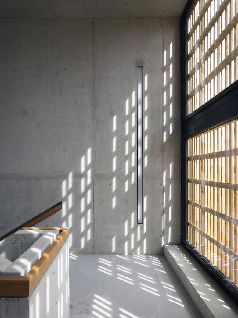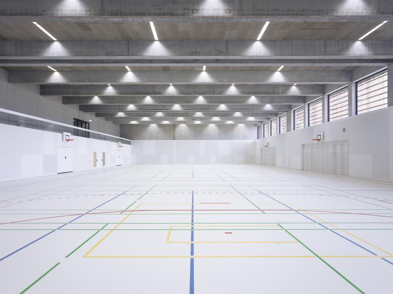 Die vertikal gegliederte, halbtransparente Holzfassade markiert ein eigenständiges Äusseres. Die akzentuierte Lichtführung in der Sporthalle und den Schulkorridoren unterstreicht die Raumqualität. Beton, Steinholz und weiss lackiertes Holz im Inneren wirken zurückhaltend. Die Benutzer selbst setzen Farbakzente in den Räumen.