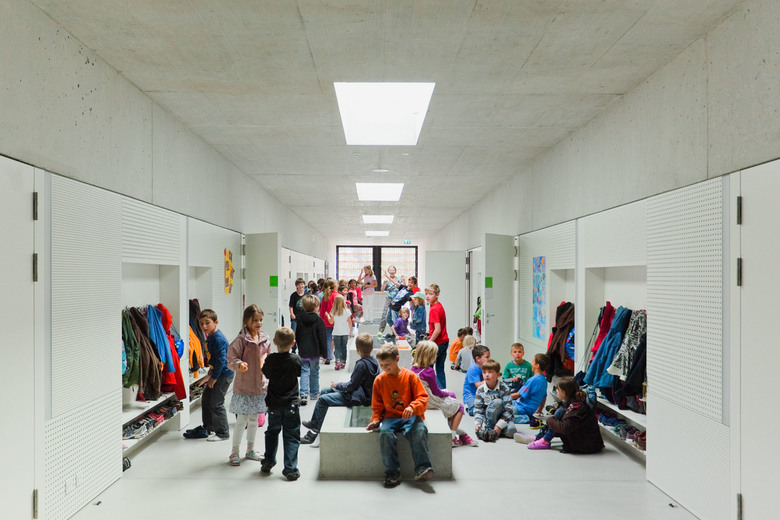 Die Erweiterung des Schulhauses wurde durch einen Neubau mit einfacher Gliederung und grösstenteils unbehandelten Materialien kostengünstig realisiert.
