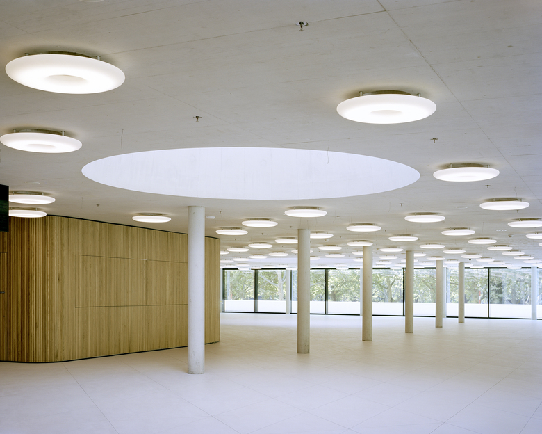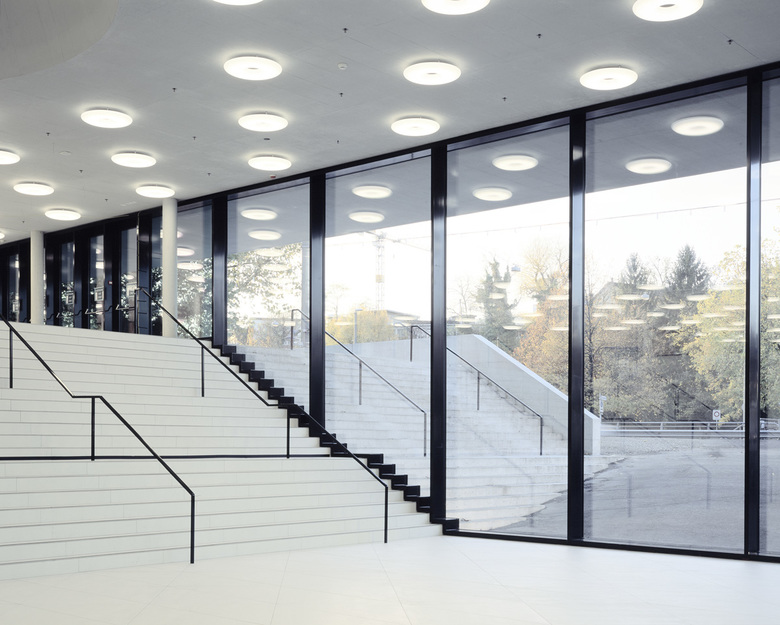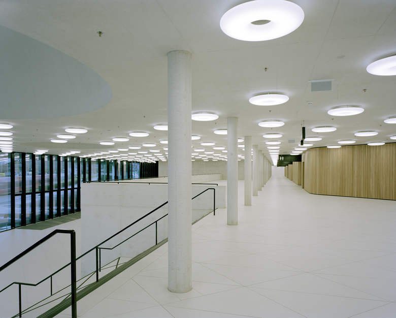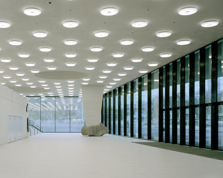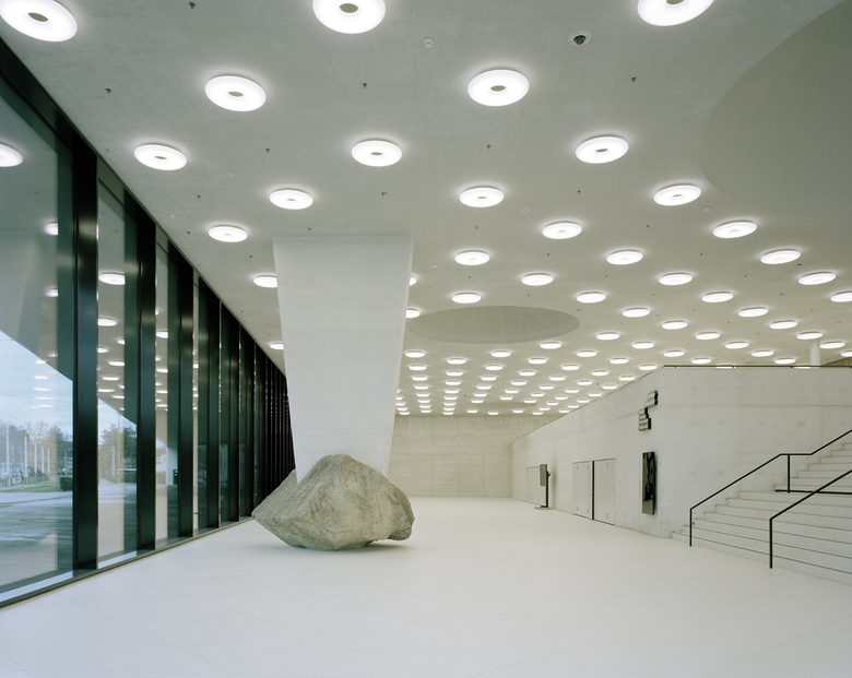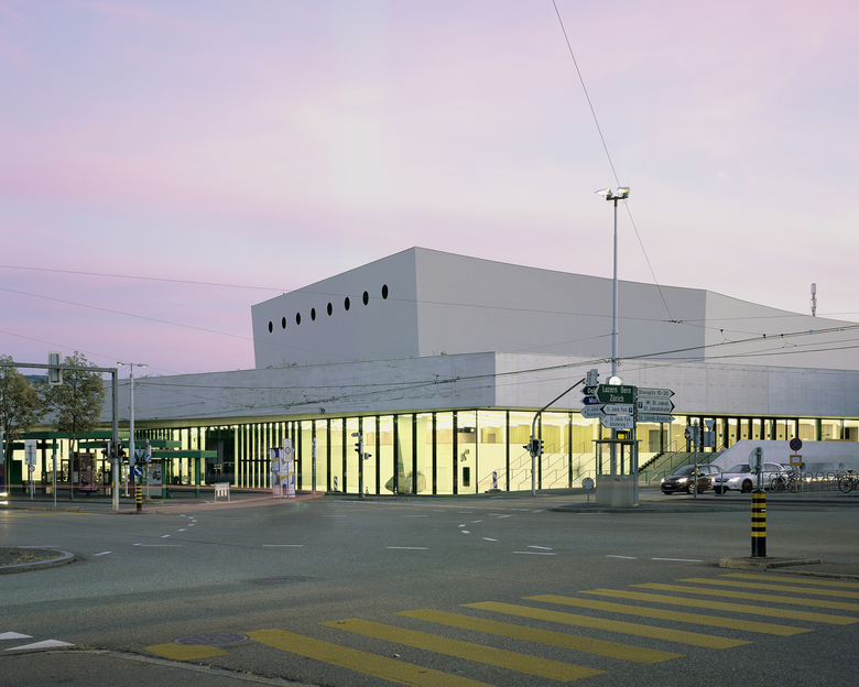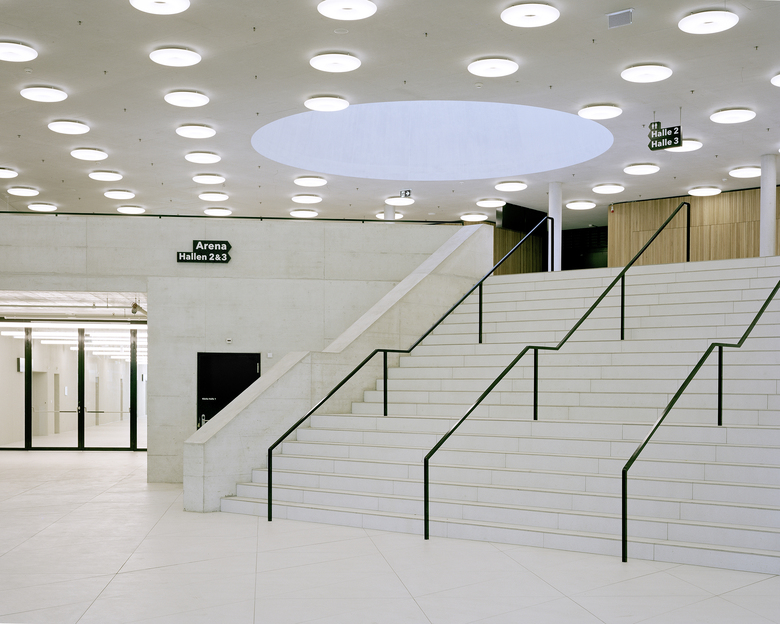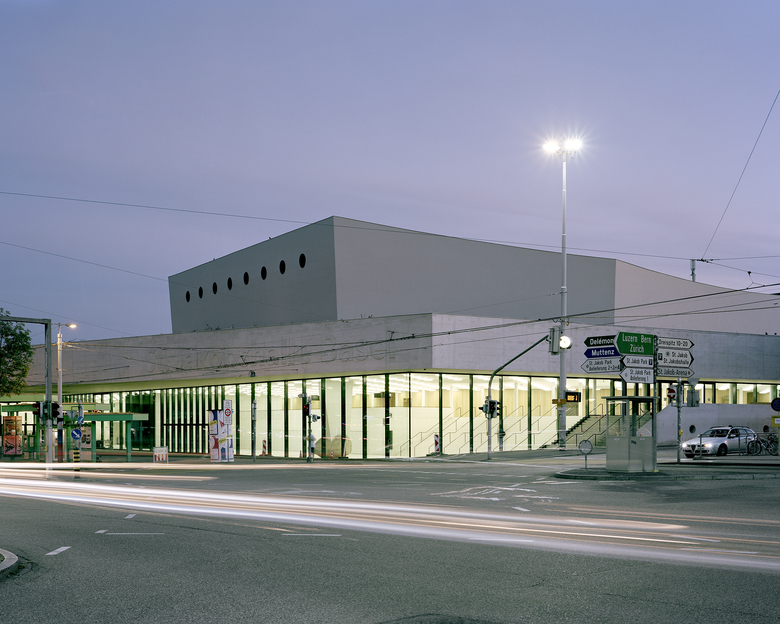 Mit dem Wettbewerb zur Sanierung der St. Jakobshalle bot sich die Chance, die seinerzeit vorbildliche Halle an heutige Anforderderungen anzupassen – eine Halle für multifunktionale Events wie Tennisveranstaltungen oder Konzerte mit hohem Publikumsaufkommen. Zentrales Anliegen des Wettbewerbsentwurfes war, den Charakter der brutalistischen Halle aus den 1970er Jahren zu erhalten. Es galt, den Bestand mit den Neubauteilen zu einer neuen, klaren und starken Identität zu entwickeln. Dabei wurden die Qualitäten des Bestandes erhalten. Durch die Eingriffe, wie z.B. die Verlegung des Hauptzugangs, wurden sowohl funktionale als auch architektonische Qualitäten gesteigert, was zu einem stimmigen Gesamtbild führt. Das Strassenniveau wird über den neu geschaffenen Platz bis ins Gebäude geführt. Das bestehende Dach der Eingangshalle wird auf derselben Höhe fortgesetzt und mit einer markanten Stirne gefasst. Damit können alle Lüftungs- und Entrauchungseinrichtungen verdeckt und in den Innenraum integriert werden. Grosse Kuppeln, die in die Foyerfläche eingestreut sind, erweitern den Raum nach oben und erzeugen einen hellen und imposanten Raumeindruck. Im Aussenraum bildet das neue Dach einen geschützten Vorbereich und im Inneren generiert es ein vergrössertes Foyer. Vor dem Gebäude entsteht ein grosszügiger neuer Platz, der für Grossereignisse mit 10.000 Zuschauern angemessen ist.