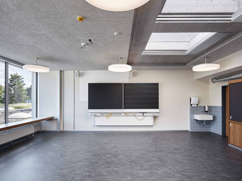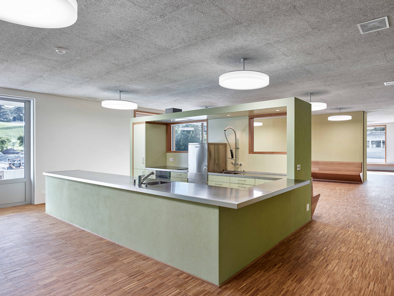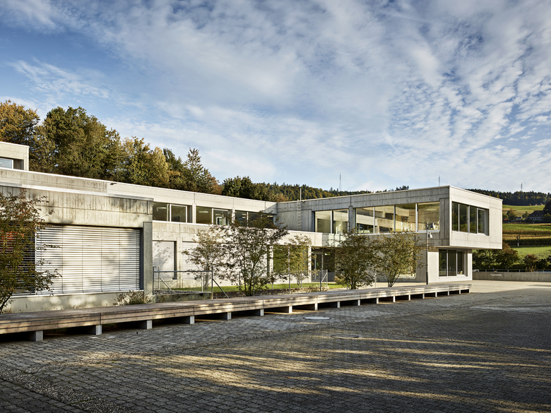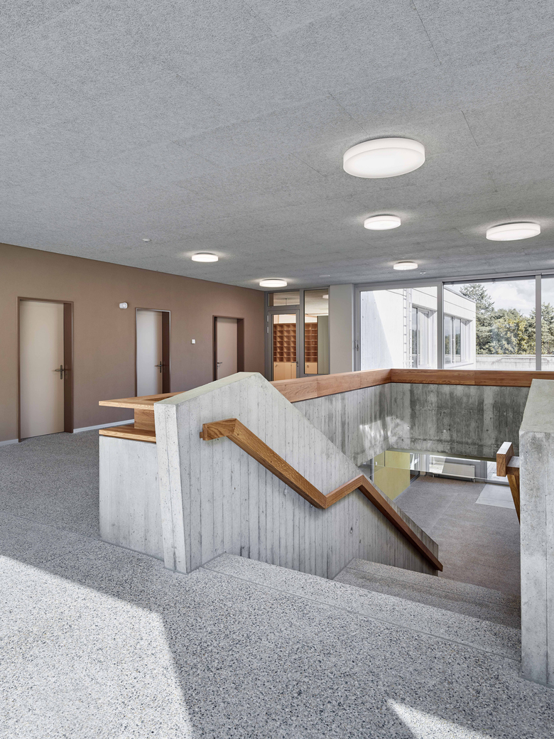 Der Entwurf greift die fast quadratischen Klassenräume, die großflächigen Fensteranordnungen mit Oberlichtern und die daraus resultierenden hohen Innenraumqualitäten auf. Durch die Erweiterung und geschickte innere Organisation sowie auf Grund der sanften Verdichtung im bestehenden Raumvolumen entwickelten sich neun zusätzliche Klassenzimmer, fünf Gruppenräume und die Tagesschule. Die eher kühle Stimmung des Bestandes mit Sichtbetonwänden und Waschbetonböden wird mit integralen Massnahmen aufgewertet und zu einem neuen Ganzen zusammengefügt. So werden mit Holz bei Schränken und Absturzsicherungen stärkere Akzente gesetzt, eine weichere und gleichzeitig effizientere Beleuchtung schafft eine angenehme Atmosphäre und das sich im Anbau verdichtende Farbkonzept strahlt Freundlichkeit und Wärme aus.