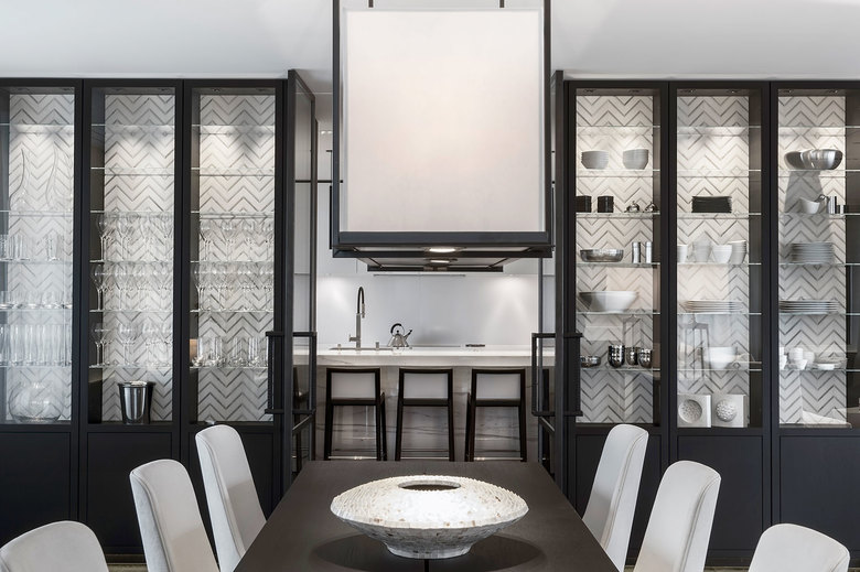 Die Wohnung wurde im Rohbau übernommen und von A-Z neu geplant. Dadurch entstanden drei wichtige Flächen. Ein öffentlicher Wohn- und Essbereich mit Küche sowie Billardzimmer. Der halbprivate Bereich ist für Gäste bestimmt. Zum privaten Schlaftrakt mit zwei Master Suiten gehören zwei Bäder und eine gemeinsame Ankleide.