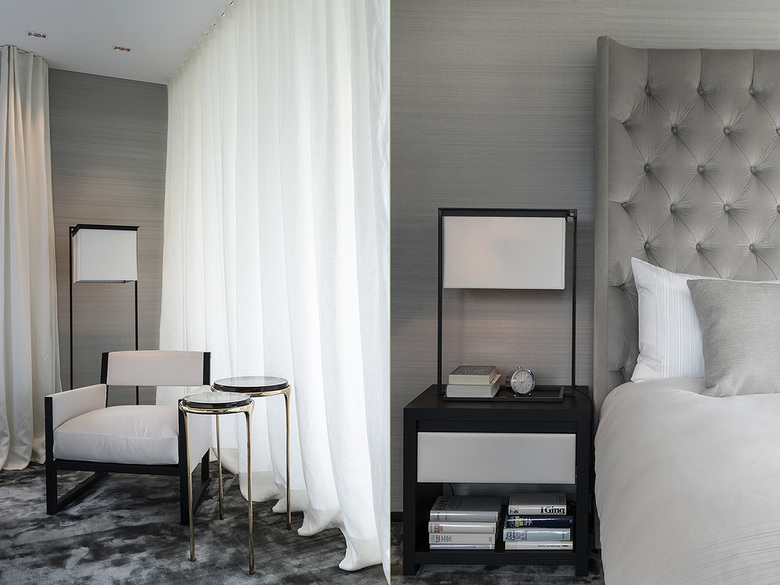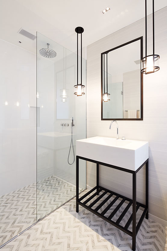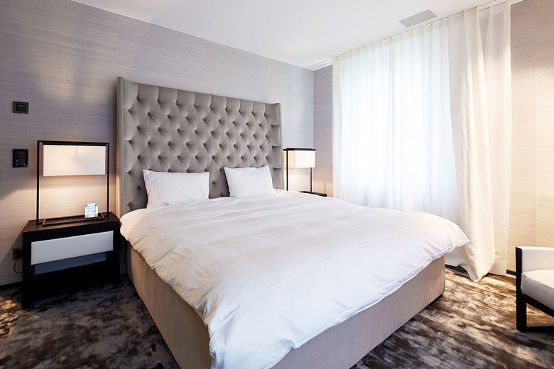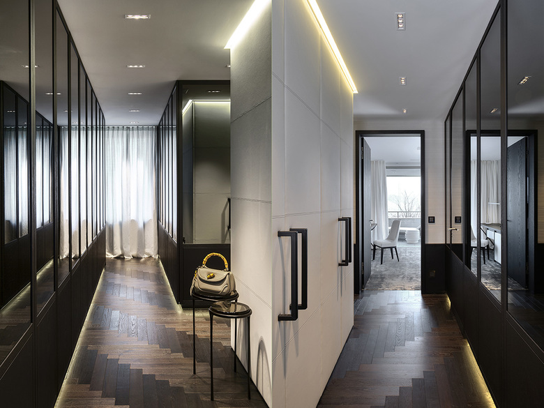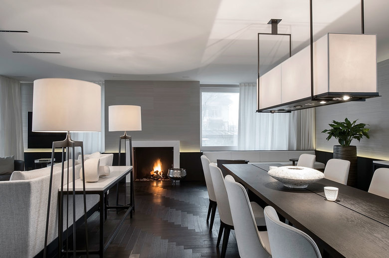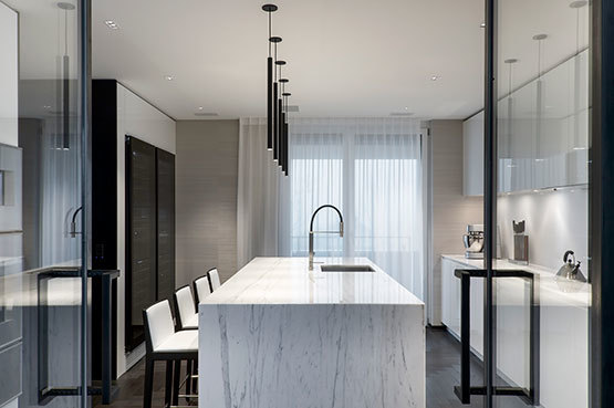 Das elegante Konzept im Stil einer durchgestylten Penthouse Wohnung konnte dank voller Unterstützung der Bauherrschaft konsequent umgesetzt werden. Der Wunsch nach einem monochromen Interieur wurde unter Verwendung edelster Materialien wie Räuchereiche, Calacatta und weissem Thassos Marmor umgesetzt. Dunkelgraue Seidenteppiche und hellgraue japanische Hanftapeten runden das Bild ab. Die wertvollen Einbauten in der Ankleide, der Lederschrank im Zentrum des privaten Trakts, sowie die Vitrinen im Küchenbereich sind markante Eckpfeiler des massgeschneiderten Designs.