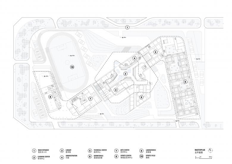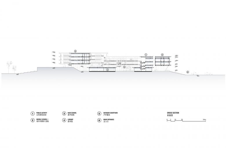 The cloud-shaped learning center, centrally located on the campus, appears to float above the library and other public spaces. It serves as the main hub for interaction between teachers and students, housing classrooms for both the middle school and high school departments. Flanking the cloud, the building strip is arranged according to the natural contours of the terrain, providing a variety of 'micro-environments' that include a maker space, art center, sports facilities, and a dormitory complex.