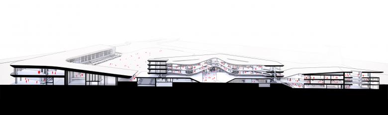 Connected Learning Spaces – The dynamic S-shaped building strip weaves through the entire campus, organically connecting the living, teaching, and sports areas. From its midpoint beneath the cloud, the building strip rises, reaching its full height at the dormitory on one side and the sports center on the other.