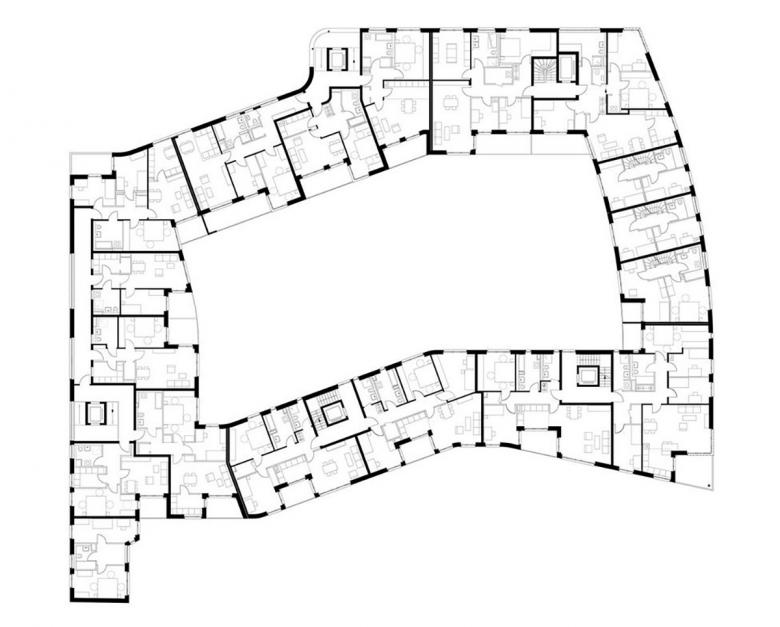 Durch Fußwege sind die Gartenhöfe intensiv mit der Umgebung vernetzt. Als Gegenüber des fünfgeschossigen Bestandes am Kurdamm und als Schließung des Blockrandes im Süden werden zwei logische Hochpunkte gesetzt. Auf das heterogene Umfeld und die durch Verkehr und Gewerbe erzeugten Schall- und Geruchsemissionen wird mit einer differenzierten, abschirmenden, geschlossenen Bebauung reagiert. Diese Aufgabe des Schallschutzes zum gegenüberliegenden Gewerbegebiet und zur Hauptverkehrsstraße ist vollständig in förderfähigen Grundrissen gelöst und nachgewiesen.