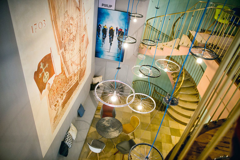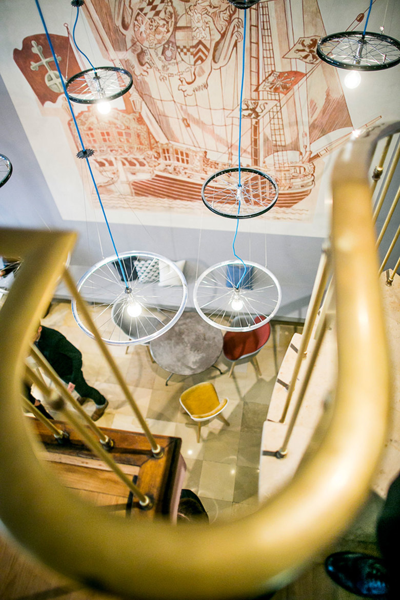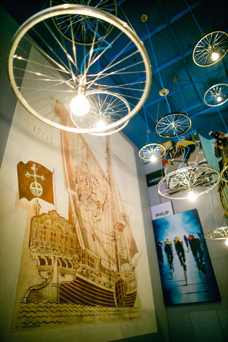 Als Treffpunkt für Radsport-begeisterte dreht sich im Café Vélo alles um den Tour de France Start 2017 in Düsseldorf. Auch die Einrichtung nimmt darauf Bezug. Von der hohen Decke hängen Lampen, welche aus Fahrradfelgen gefertigt wurden. Ein Zeichen deutsch-französischer Radkultur.