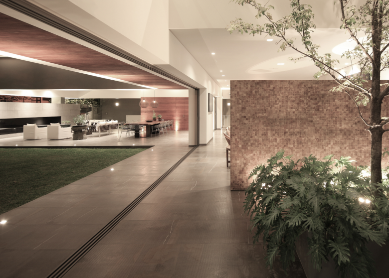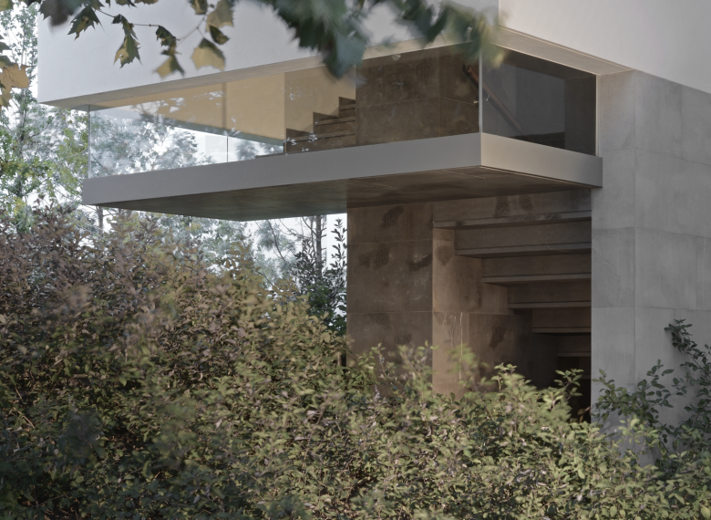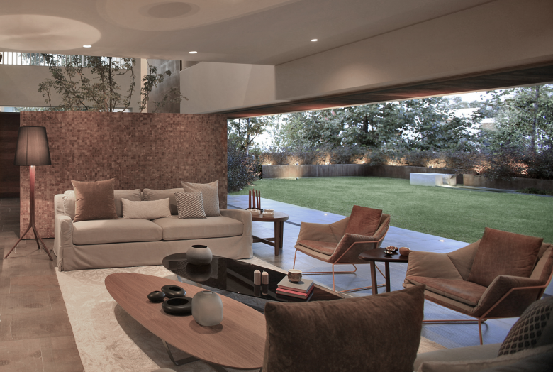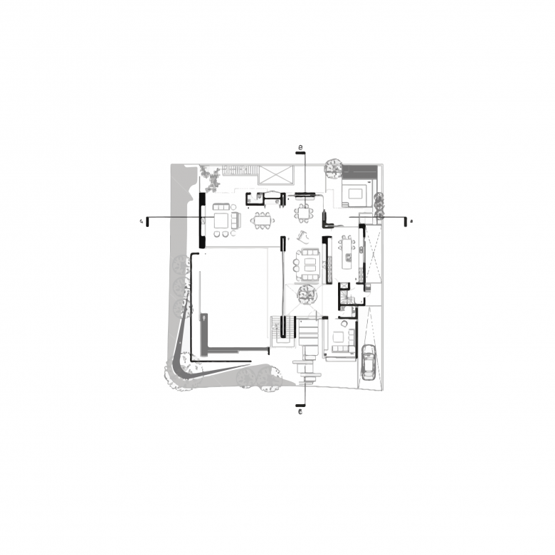 El concepto de la casa VM es invertir el esquema tradicional de jardín posterior, con fachada frontal, para generar una volumetría donde el jardín permanezca al límite de las colindancias frontales y abrazadas por los volúmenes que delimitan las servidumbres posteriores. La casa se desarrolla sobre los bordes de las servidumbres laterales y posteriores en forma de “L” para aprovechar la esquina del terreno como un jardín frontal que da continuidad a las áreas verdes del fraccionamiento.