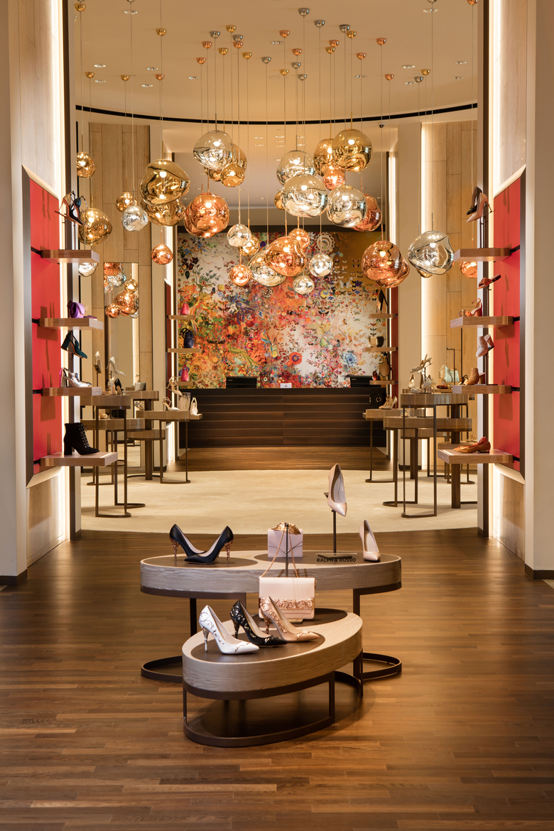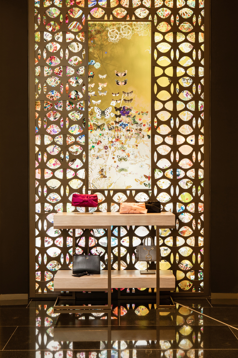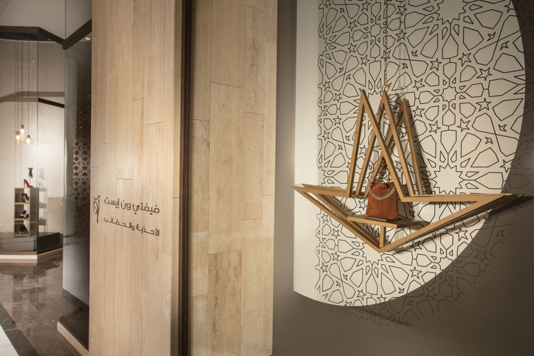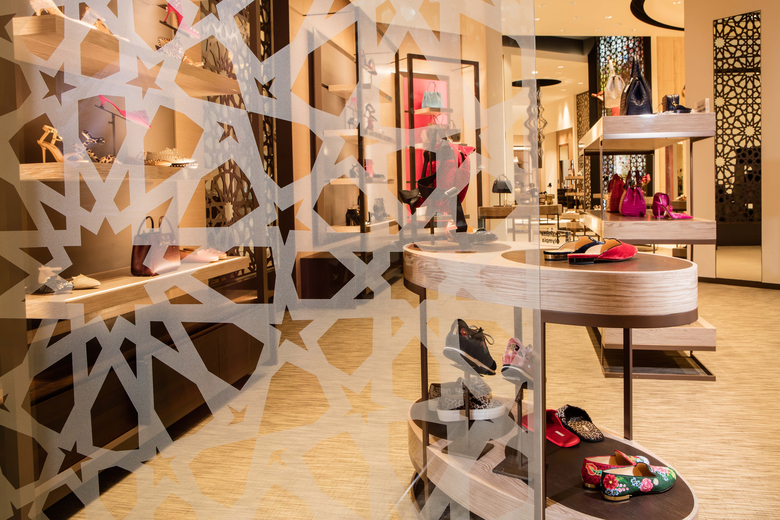 Die Herausforderung des grosszügigen Grundrisses mit zahlreichen Säulen und beeindruckender Deckenhöhe meisterten wir durch eine geschickte Segmentierung. Jeder Bereich der Verkaufsfläche ist auf eine Taschen- oder Schuh-Marke zugeschnitten und lädt zum Entdecken ein. Das Layout garantiert ausserdem ausreichend Privatsphäre, unter anderem dank arabesker Dekor-Elemente mit Referenz zur Region.