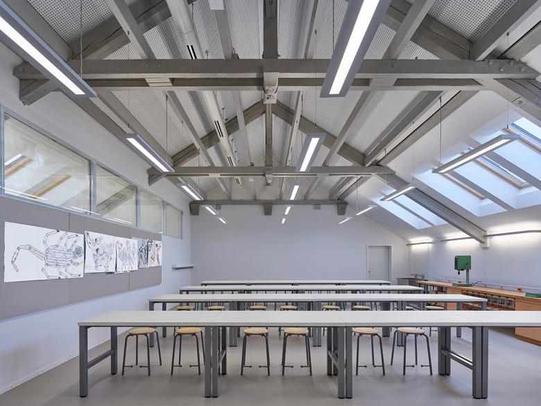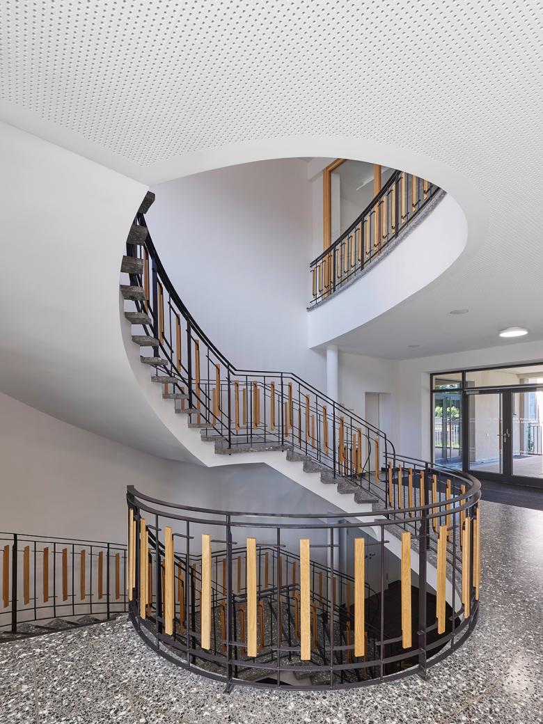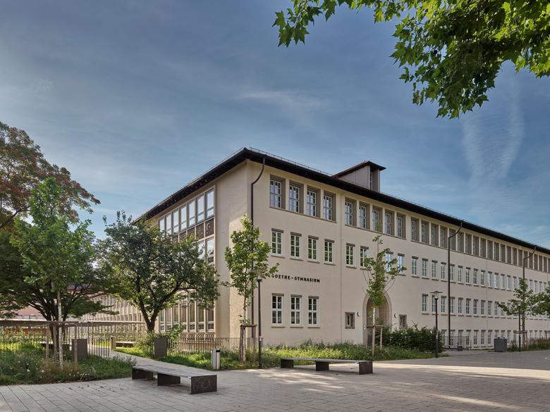 Das Goethe-Gymnasium Ludwigsburg besteht aus drei Gebäudetrakten: Während das 4-geschossige Hauptgebäude aus dem Jahr 1951 auf eine Planung aus der Vorkriegszeit zurückgeht, sieht man dem niedrigeren Zwischentrakt und dem Turnhallengebäude aus den späteren 1950er-Jahren die Nachkriegs-Moderne deutlich an. Das Ensemble steht nicht unter Denkmalschutz, trotzdem sollte bei der Generalsanierung der Charakter der Gebäude erhalten bleiben. Beim massiven Hauptgebäude mit seinen Naturstein-Elementen wurde auf einen Vollwärmeschutz verzichtet, jedoch Dach und Fenster erneuert. Der Zwischentrakt erhielt eine Fassadendämmung, mit Betonfertigteilen auf der Nordfassade vor den ungedämmten Betonpfeilern; der Turnhallenbau bleibt vorerst unsaniert. Im Innern der bisherigen Bauabschnitte wurden die komplette Haustechnik, die Sanitärbereiche und der Innenausbau erneuert. Der Brandschutz und die Raumakustik wurden auf Stand gebracht, sowie Einzelbereiche behutsam umstrukturiert. Ein konsequentes Materialkonzept mit Holzelementen in Eiche erzeugt eine zeitgemäße, helle Lernumgebung.