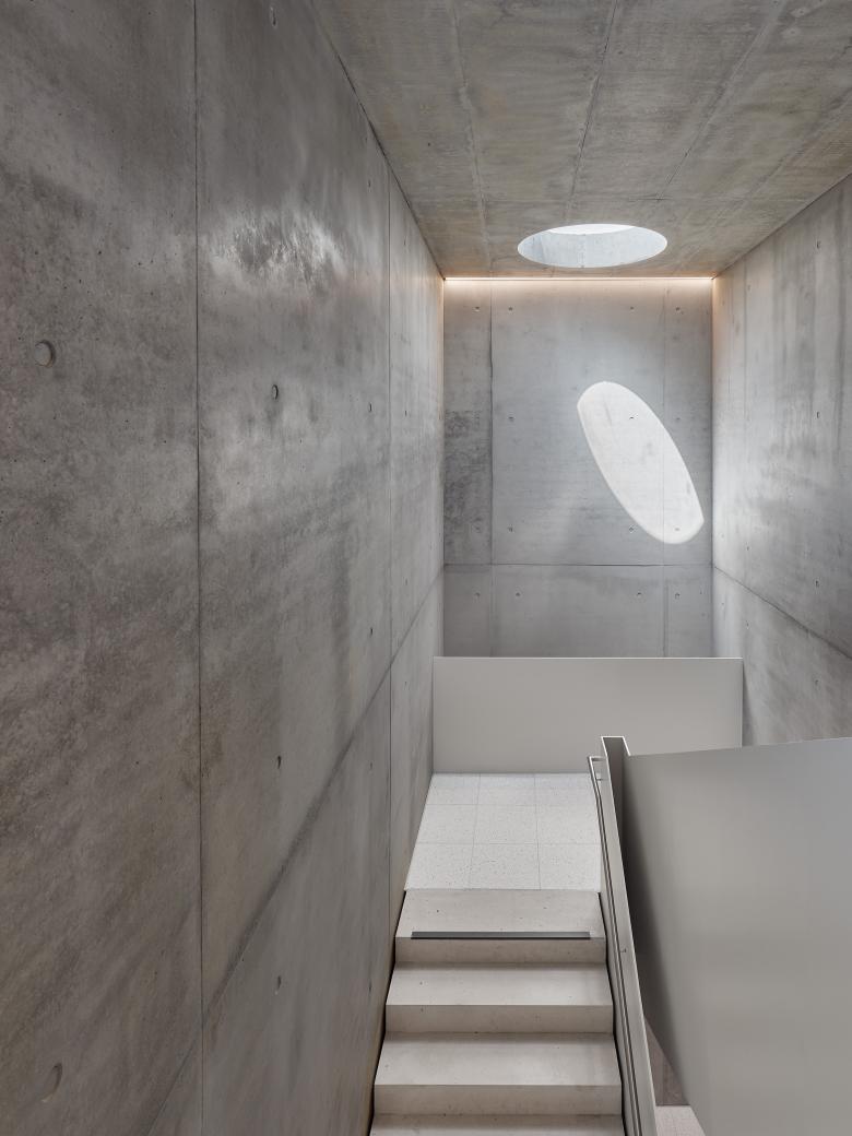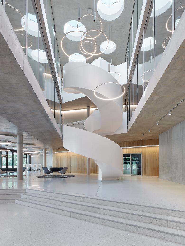 Der neue Hauptsitz des Steinbeis-Verbundes ist ein Erweiterungsbau einer von unserem Büro bereits 2000 fertiggestellten Privathochschule. Der Neubau mit seiner unregelmäßigen Grundfläche nutzt das dreieckige Baufeld maximal aus. In den Obergeschossen wird die Fassade durch großzügige Fensterelemente in nur einer Größe rhythmisiert, während im Erdgeschoss bodentiefe Fassadenbänder auf die hier anzutreffenden Sondernutzungen reagieren und das Foyer optisch auf voller Breite zum Außenraum öffnen. Im Inneren gliedert ein unregelmäßiges, von oben belichtetes Atrium die Büroflächen der Obergeschosse in vier kleinere Einheiten und dient zudem mit seiner eingestellten Wendeltreppe als vertikale Haupterschließung des Hauses. Über die großzügigen Fensterelemente der Außenfassaden und die verglasten Innenfassaden zum zentralen Atrium entstanden gut belichtete, transparente und übersichtliche Büroflächen, die sowohl individuelle Arbeitsplätze als auch Kommunikations- und Rückzugsorte ausbilden.