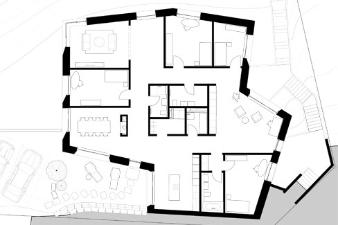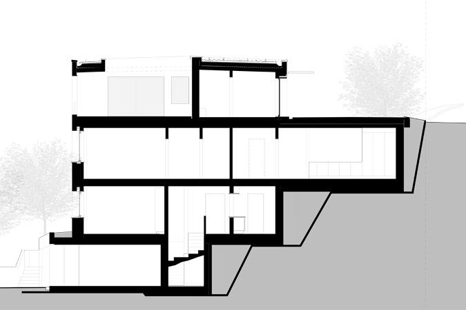 Für ein Mehrfamilienhaus in Baden entwerfen wir innerhalb einer schmalen, dreieckigen Parzelle am Hang einen kubischen Solitär, der dem gebauten Kontext trotzt und sich im Hang verankert. Es gibt kein Treppenhaus, vielmehr sind drei Wohnungen derart gestapelt, dass sie jeweils einen eigenständigen Zugang erhalten. Jede Wohnung basiert auf einer kreuzförmigen Grundstruktur, diese wird jedoch individuell interpretiert: Im Erdgeschoss entsteht eine Familienwohnung mit grosser Wohnküche, Terrasse und Garten. Darüber befindet sich eine Loftwohnung mit herrlichem Ausblick in das Limmattal, und die Dachwohnung basiert auf einem Raum-zu-Raum-Prinzip mit privatem, innen liegendem Patio.