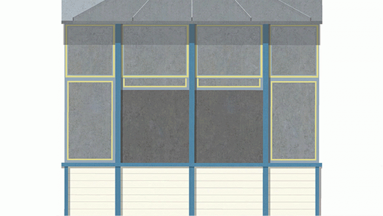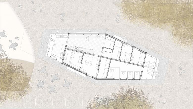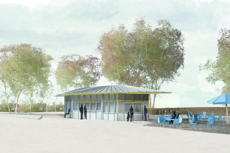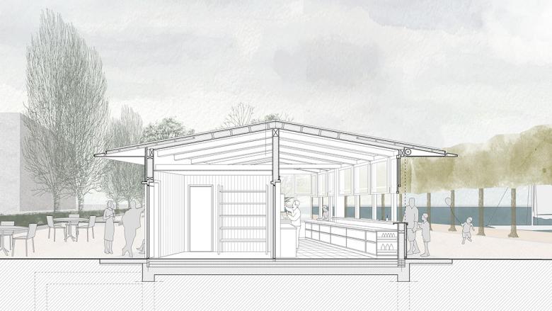 Der Kiosk will nicht mehr sein als er ist. Er ist keine Skulptur und kein Objekt, das nach Aufmerksamkeit sucht, sondern eine sorgfältig plazierte Gebrauchsarchitektur. Eine Bude, an der man sich verpflegen kann, mit zwei Toiletten. Er ist längsgerichtet, wie die Promenade selbst und sucht die Nähe der grossen Schnurbäume, die das Ende der Hafenpromenade besetzen. Die schräg zulaufende «Nase» streckt sich dem Freiraum entgegen, ein Vordach bietet Schutz. Auf der anderen Seite wird man von einer Sitzbank empfangen. Es gibt keine Rückseite. Der kleine Baukörper ist von allen Seiten zugänglich. Zum See hin bieten Glasvitrinen genügend Auslageflächen, um kleine Köstlichkeiten präsentieren zu können. Die Hebefenster können individuell geöffnet werden, sodass – je nach Jahreszeit – ein, zwei oder sogar drei Personen nebeneinander arbeiten können. In der kalten Jahreszeit sind nur die beiden vorderen Fenster geöffnet, sodass der Innenraum nicht zu stark auskühlt. Bei grossem Ansturm hilft die Länge für einen zügigen Ablauf. Die Dachkonstruktion bietet Platz für einen robusten Holzrolladen, der nachts und in Wintermonaten für den Sicherheitsabschluss sorgt. Das Dach sitzt abgelöst vom Baukörper auf dem hölzernen Unterbau. Das Glasband lässt den Kiosk leicht und durchlässig wirken. Durch die parallelen Flanken passt sich der Bau gut zwischen die Baulinien ein ohne sich den Bewegungsflüssen unterzuordnen. Denn ein bisschen kantig darf er schon sein, dieser Kiosk an der neuen Hafenpromenade.