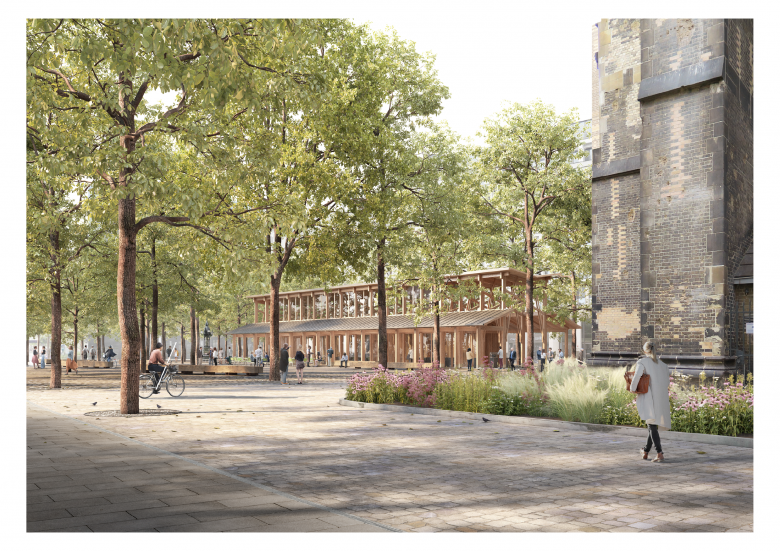 In Analogie einer überdachten Ausgrabungsstätte präsentiert sich der Ausstellungspavillon auf dem neu gestalteten Hopfenmarkt. Er überspannt den „Einschnitt“ in die Unterwelt, wo die Grundmauern Hamburgs erster Siedlung freigelegt werden und künftig zu besichtigen sind. Seine Ausrichtung orientiert sich am Verlauf der unterirdischen Wallanlage und weicht damit den „oberirdischen“ Richtungen des Hopfenmarktes und der Kirchenruine mit einem leichten Dreh aus. Gleichzeitig stellt der Pavillon eine Reminiszenz an die Markthallen des Hopfenmarktes dar, die lange Zeit an diesem Ort standen. Das minimalistische Raumprogramm aus Eingangsbereich mit Kasse und kleiner Cafébar sowie den zugehörigen Nebennutzungen ist in einer Halle aus Licht untergebracht, die in den Abendstunden wie eine Laterne diesen besonderen Ort erleuchtet. Zwei spiegelsymetrisch angeordnete Treppen führen den Besucher hinunter in die Ausstellung und geleitet ihn am Ende des Rundgangs wieder hinauf ins Foyer und zur neu gestalteten Parkanlage. Eine Pavillonarchitektur in Holzbauweise: eine typische Konstruktionsmethode temporärer Bauten, Holz ein traditioneller und archaischer Baustoff. Der Neubau spielt mit dem Faktor Zeit, möchte auf die Flüchtigkeit der Geschichte, auf die Überlagerung verschiedener historischer Schichten an diesem Ort verweisen und erlangt dadurch seine ganz eigene Identität als Pendant zur steinernen Ruine der Nikolaikirche.