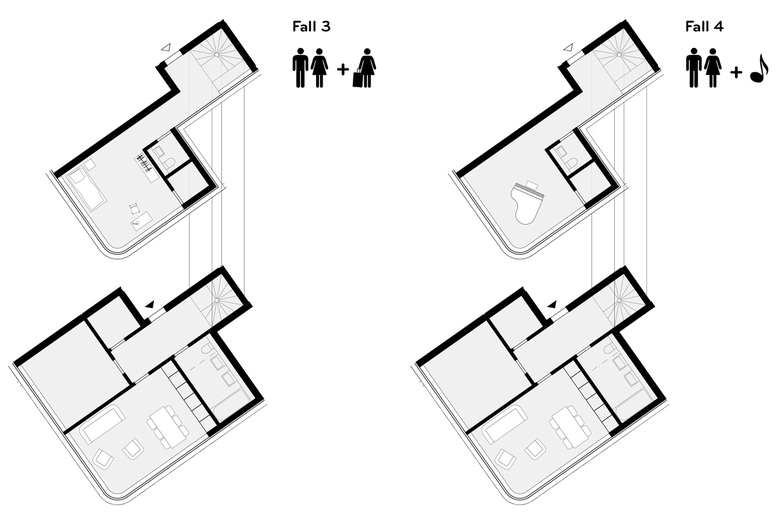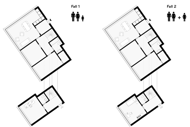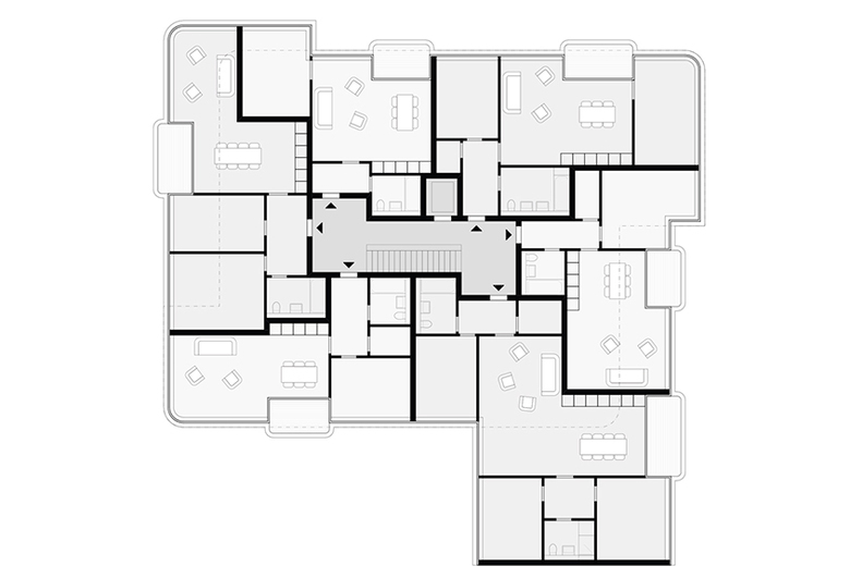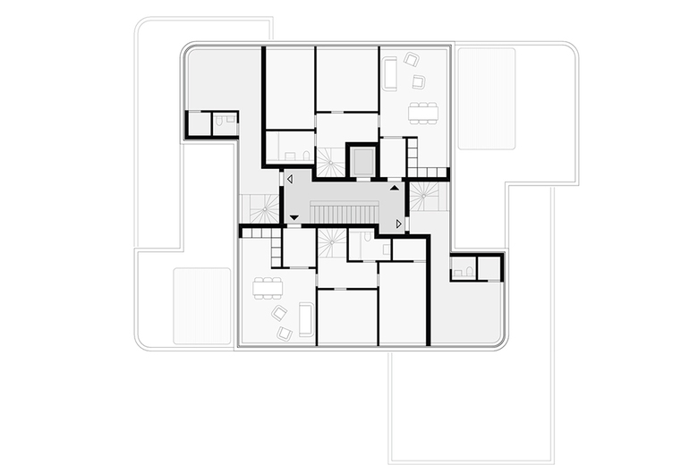 Eine räumliche Antwort auf das sich ständig wandelnde Bewohnerprofil sind die vier «Stöckli»-Zimmer der Dachgeschosse. Diese sind mit der darüber oder darunterliegenden Wohnung verbunden und haben einen separaten Eingang und eine eigene Nasszelle. Das «Stöckli»-System bietet sich sowohl für das Mehrgenerationen-Wohnen als auch für Selbständige, die flexiblen Arbeitsraum benötigen an, ebenso wie für Einwohner, die den Raum für ihre Freizeitaktivitäten nutzen möchten.