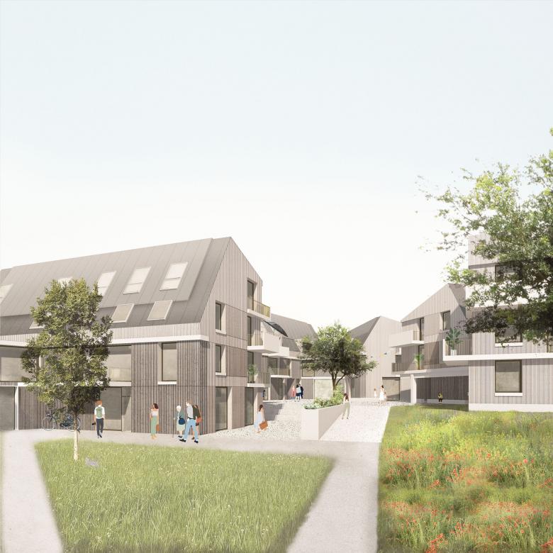 Die Frage nach dem Unterschied zwischen Dorf und Stadt begleitet dieses Projekt. Zwei sich gleichende, aber unterschiedlich grosse Häuser verbinden sich zu einem Gebäude. Entfernt erinnern sie an einen Bauernhof: Wohngebäude mit Wirtschaftsgebäude daneben. Die sich einander zuneigenden Dächer schaffen eine Pseudosymmetrie und die Ambivalenz in der Lesbarkeit. Im Gewohnten entsteht hier etwas Neues, und das Einzelne verschmilzt mit dem grossen Ganzen. Die Aussenräume differenzieren sich in unterschiedliche Stufen der Öffentlichkeit und fokussieren sich auf den zentralen Dorfplatz in der Mitte. Der Wohnungsmix ist von Vielfalt geprägt und reicht von Studioappartments zu einer dreigeschossigen Clusterwohnung. Die Eingangshallen mit angrenzenden Waschküchen dienen als Begegnungsort und übergeordnete Nutzungen wie Mehrzwecksaal, KiTa oder der kleine Sakralraum schaffen zum Dorfplatz hin orientiert eine wohldosierte Öffentlichkeit. Lufträume, Maisonettetypologien mit Galerien und eingeschnitten Patios sorgen in den Dachgeschosswohnungen für spannende Raumabfolgen und ganz eigene Charaktere.