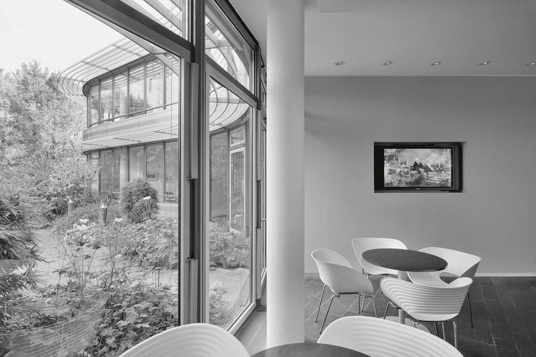 In der lichten Eingangshalle führt der Blick gleich in die Tiefe des Raumes, auf die Treppe in das Obergeschoss und auf die Glaswand mit den Fotos des Schweizer Künstlers Beat Streuli. Seine Tafeln mit den Porträts von Menschen aus aller Welt spiegeln sich nicht allein auf dem Boden, sondern auch auf der Biegung der Brüstung über dem Windfang wider. Hinter der Glaswand liegen ein Café und ein Restaurant, beide mit Zugang zur Terrasse im Gartenhof.