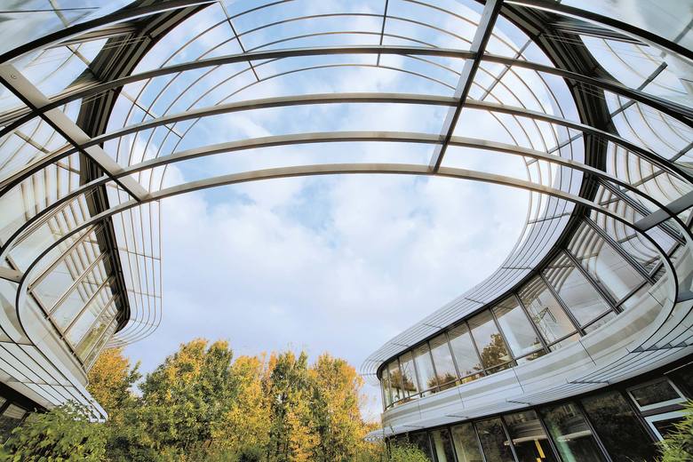 des Sonnenschutzes – beide aus mattem Aluminium – geben der Architektur etwas selten Homogenes. Und ihren vollen Schwung.