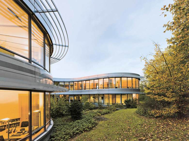 Ein Stück westlich der Mitte von Wülfrath, auf dem Areal eines früheren Steinbruches und auf stark fallendem Gelände liegt das gestreckte Gebäude mit dem Grundriss eines großen H. Dank seiner weichen, runden Ecken ähnelt der Umriss eher der Gestalt eines Schmetterlings. Und dank seiner perfekten Symmetrie macht der Bau, jedenfalls auf dem Weg zum Eingang mit dem großen Vordach aus Stahl und Glas, einen gleichsam herrschaftlichen Eindruck. Die gespannte, gekrümmte Außenhaut und die Gitterstreifen