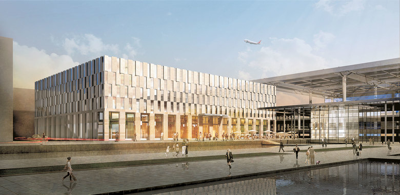 Vor der Haupthalle des neuen Flughafens Berlin Brandenburg International liegt eine weite Plaza, an der sich die Gebäude zahlreicher Dienstleister reihen. Eines der größten Häuser dieser Plaza – gelegen an ihrer Südseite und in nächster Nähe des gläsernen Terminals – ist das Hotel Steigenberger.
